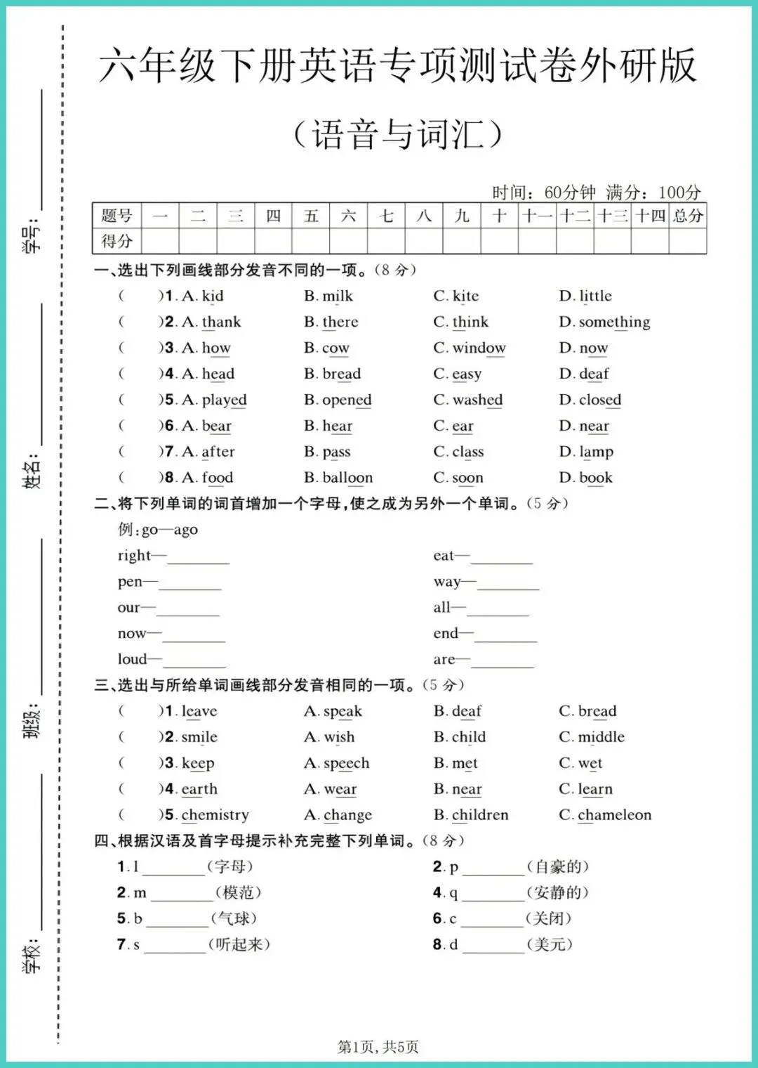 2026春外研版六年级下册英语《语音与词汇专项测试卷》新鲜出炉!5页精炼,专为小升初语音词汇卡点设计。涵盖外研六下全部音标拼读规则、高频易错词汇、情景分类词组,附赠“听音能写、见词能读”速记表,让孩子一周突破发音盲区,词汇量肉眼可见上涨。每天10分钟,朗读默写双管齐下,听力、拼写、语感同步提升,期末口语测试不再怯场!想赶在毕业前把英语地基打牢的家长,现在就把这5页打印出来,娃练完直接领跑全班!