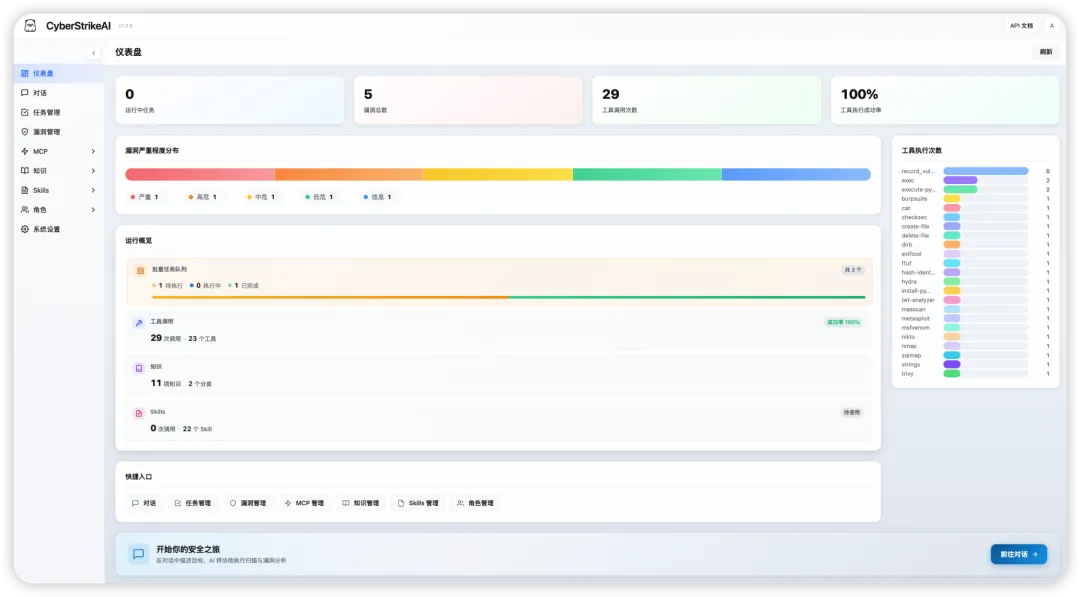 自带简洁直观的Web控制台,仪表盘实时展示系统运行状态、漏洞统计、工具使用情况,测试结果可追溯、可审计: