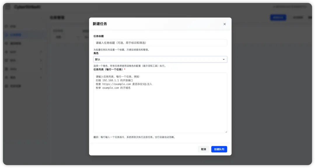 创建任务队列,每行输入一个任务指令,系统依次执行,适合批量测试场景,比如批量扫描多个目标资产,无需手动逐个操作。