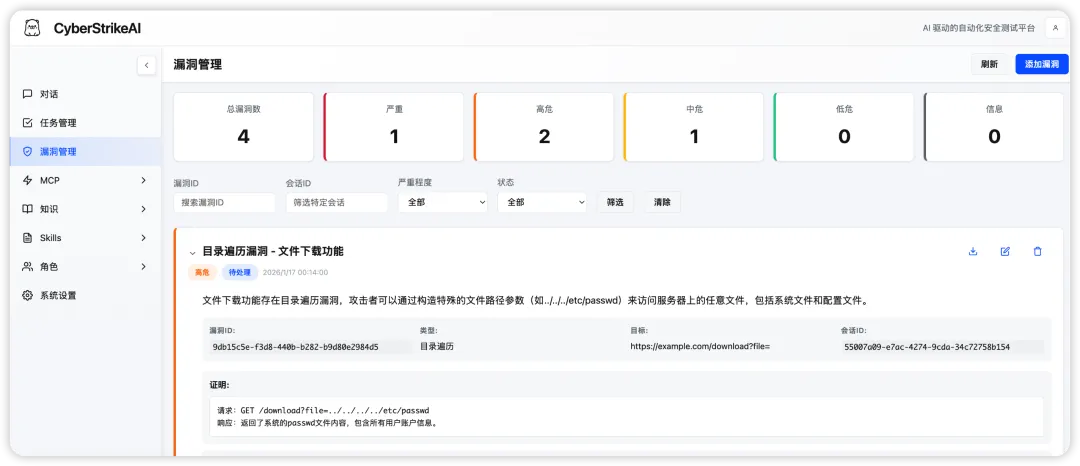 渗透测试专家:全面深入检测漏洞,适合专业攻防测试CTF竞赛专家:适配CTF解题场景,专注漏洞利用与解题技巧Web应用扫描专家:聚焦Web框架漏洞,精准挖掘Web安全隐患云安全审计专家:适配多云环境,检测云服务安全漏洞同时支持自定义角色,可根据自己的需求配置工具、技能和提示词,灵活适配个性化测试场景。