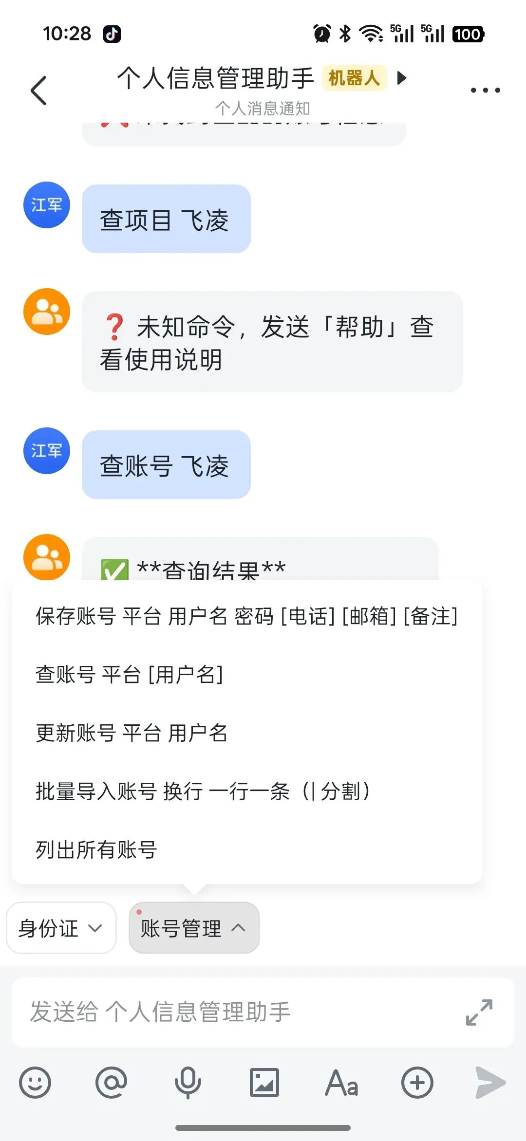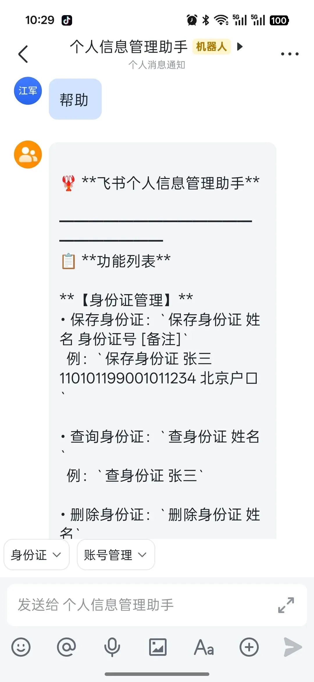 飞书个人信息管理助手【身份证管理】• 保存身份证:保存身份证 姓名 身份证号 [备注]• 查询身份证:查身份证 姓名• 删除身份证:删除身份证 姓名【账号管理】• 保存账号:保存账号 平台 用户名 密码 [电话] [邮箱] [备注]• 查询账号:查账号 平台 [用户名]• 更新账号:更新账号 平台 用户名 password=新密码• 删除账号:删除账号 平台 用户名
