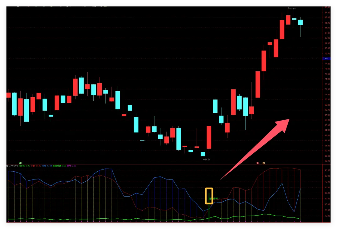 【短线反弹】:当个股强弱指标从极低位置(9以下)向上突破时,触发信号。这就是典型的“超跌反弹”,适合轻仓试错。 【黑马】:这是本指标的灵魂。它要求:① 价格金叉(趋势转正);② 必须有成交量倍增(资金进场);③ 之前必须经历过一段较长的阴跌(排除掉已经在高位的票)。三者共振,才是真正的“黑马”。