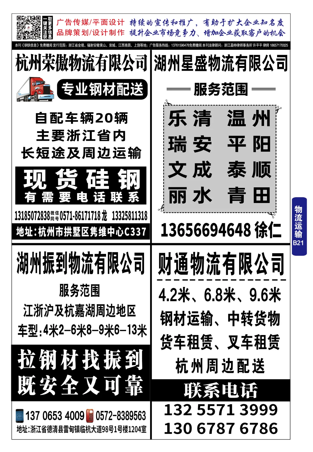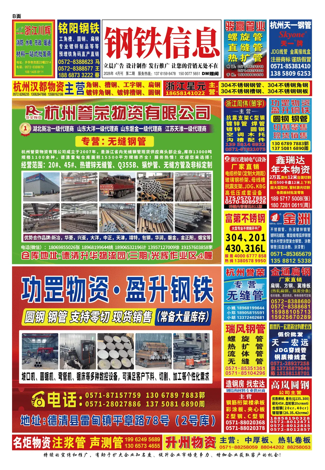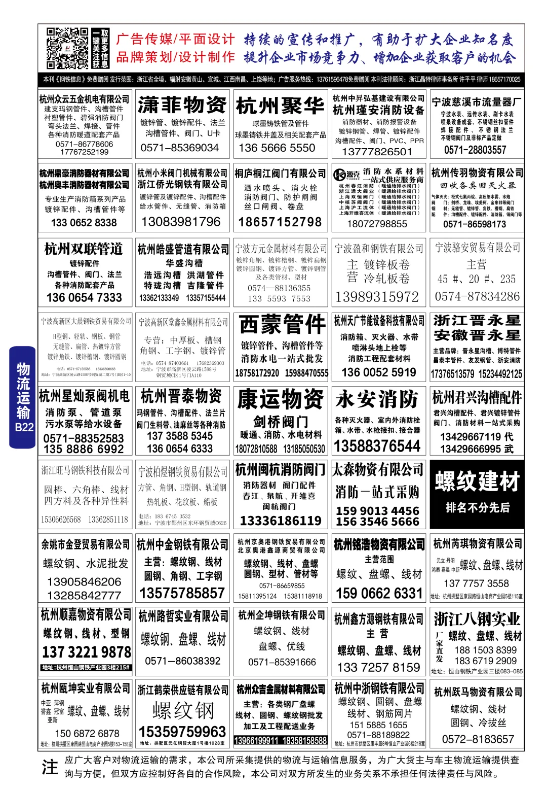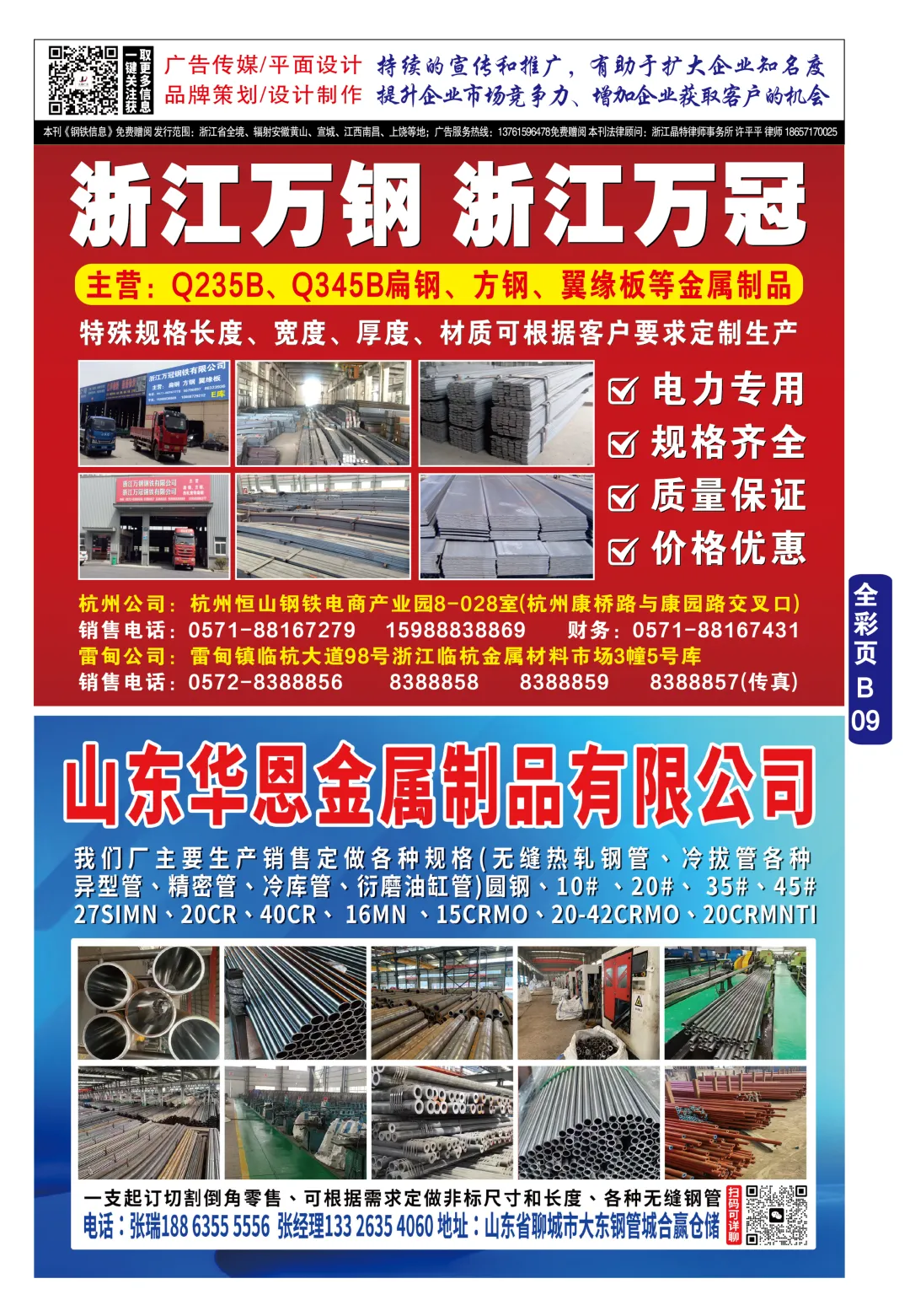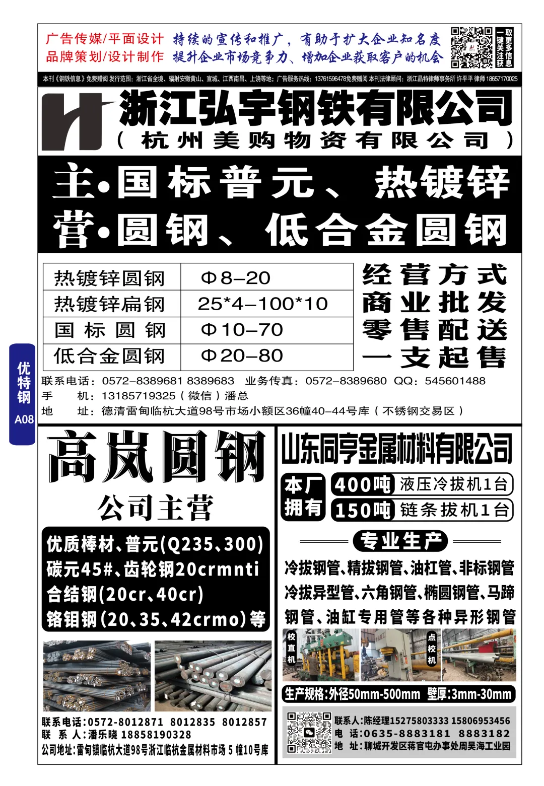 《钢铁信息》DM纸媒广告,主要是针对钢铁行业发行的一本刊物。主要以钢材信息广告资源信息、钢市信息、剪切加工配送、物流运输、仓库面门出租转让、招聘求职信息等内容为主,是一款内容较为丰富实用性较强的功能型报刊。我们所提供合作的每一家供应商都是浙江地区具有一定实力和规模的优质企业,各类钢材品种齐全,真实有效。为买卖钢及相关行业用钢需求提供了方便真实的信息服务。多年来,深受广大买卖商家的青睐