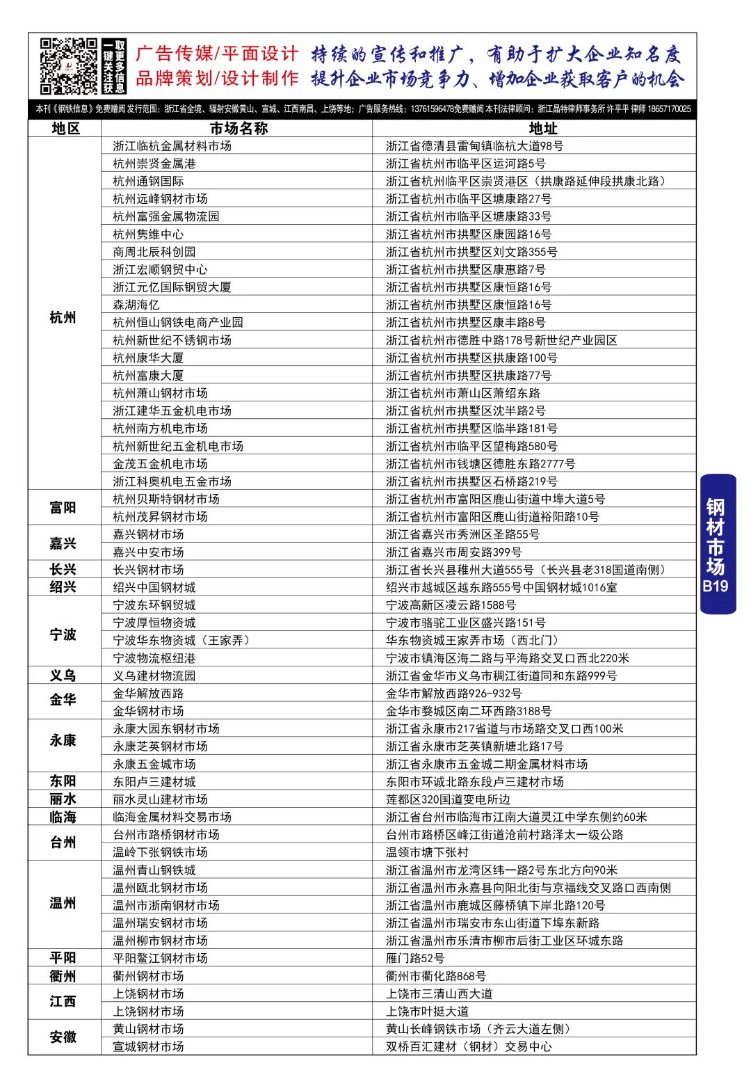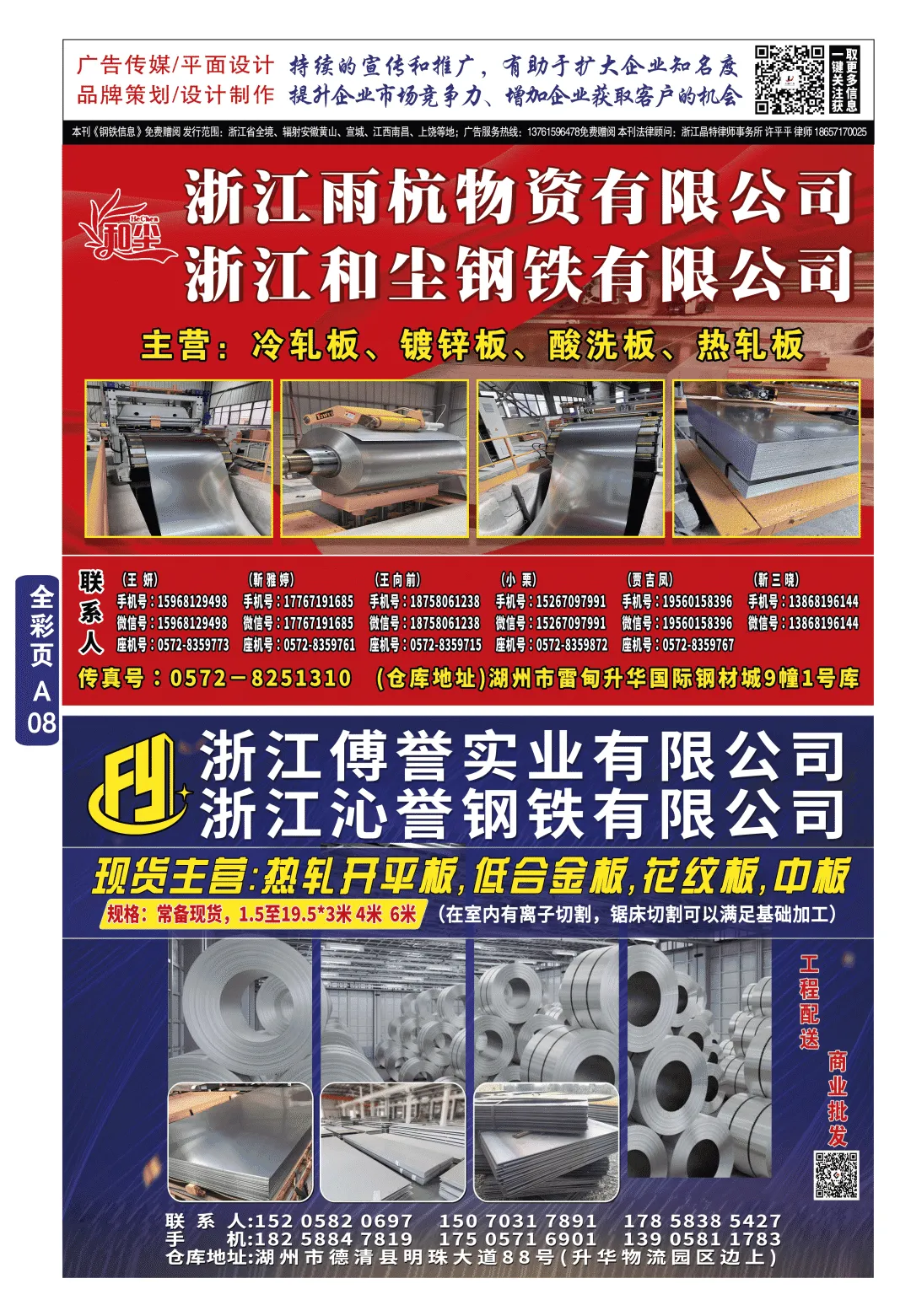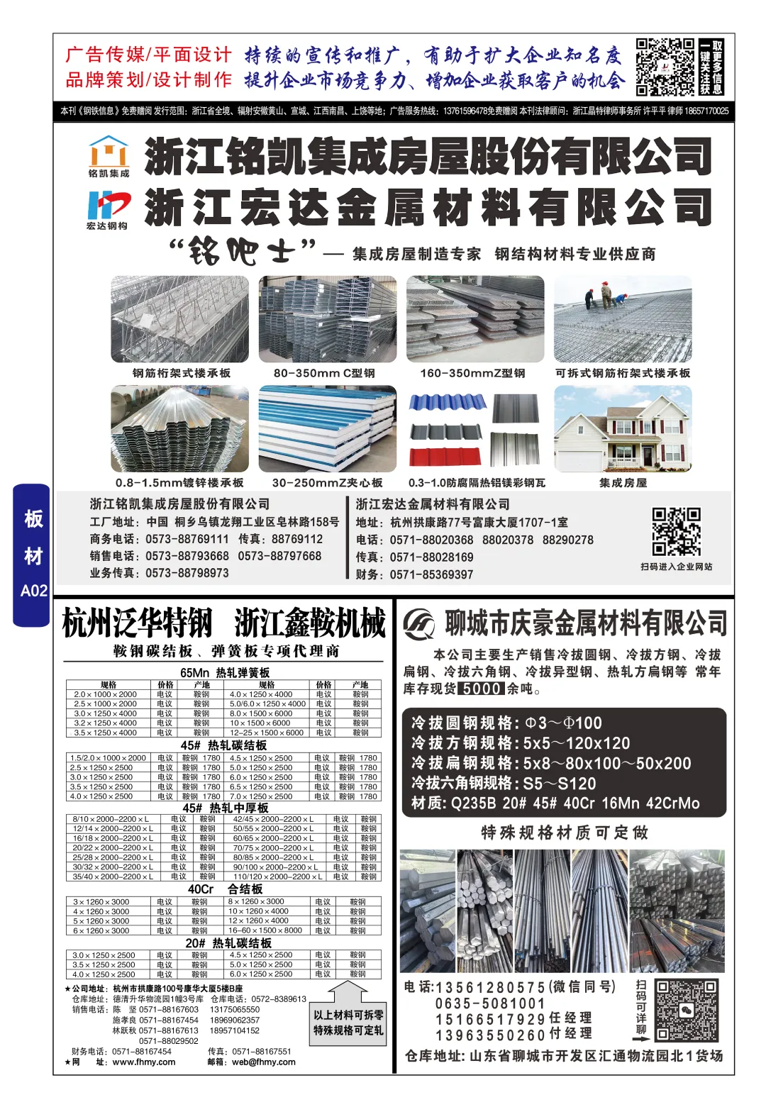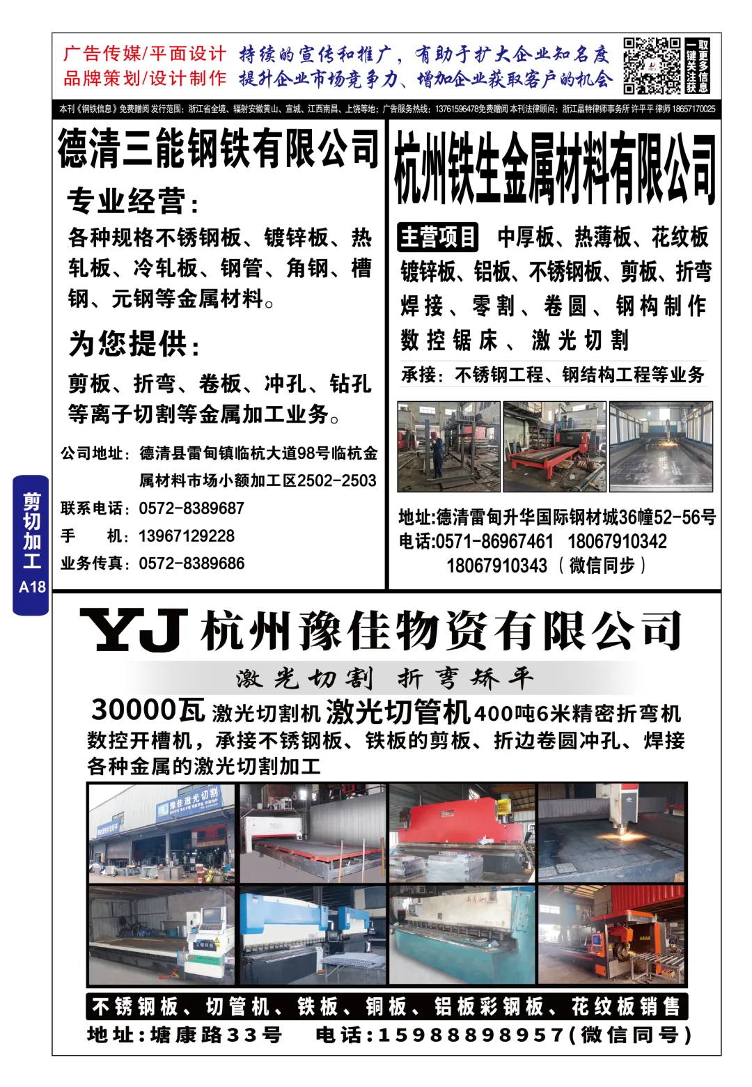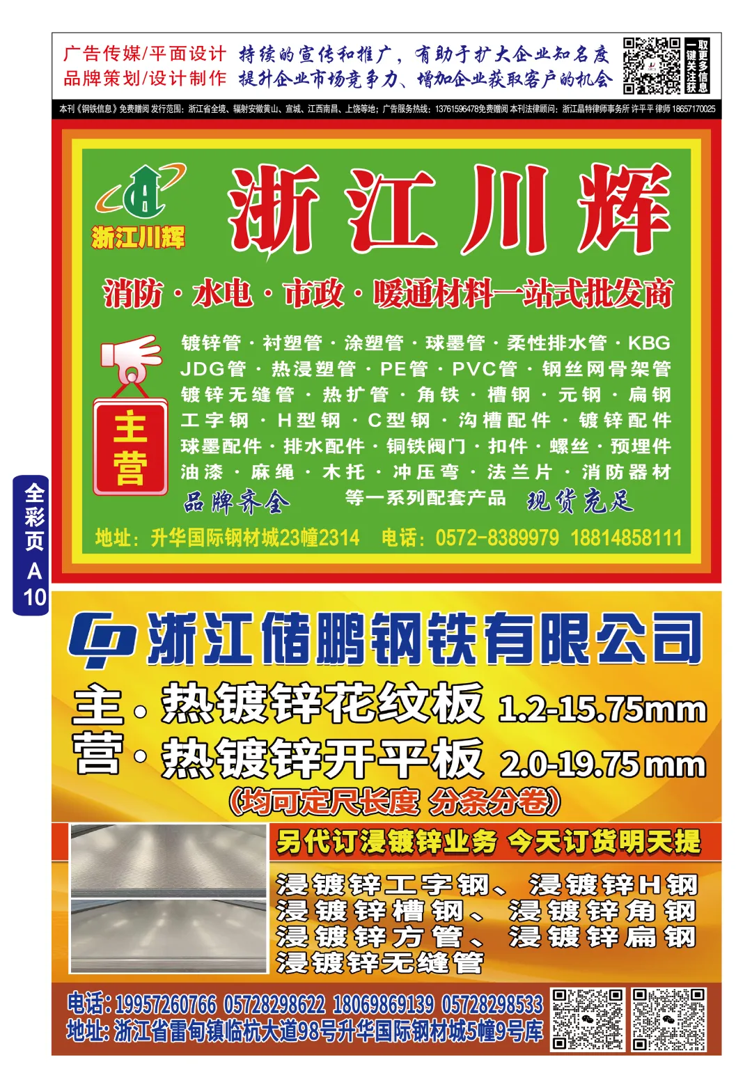《钢铁信息》DM纸媒广告,主要是针对钢铁行业发行的一本刊物。主要以钢材信息广告资源信息、钢市信息、剪切加工配送、物流运输、仓库面门出租转让、招聘求职信息等内容为主,是一款内容较为丰富实用性较强的功能型报刊。我们所提供合作的每一家供应商都是浙江地区具有一定实力和规模的优质企业,各类钢材品种齐全,真实有效。为买卖钢及相关行业用钢需求提供了方便真实的信息服务。多年来,深受广大买卖商家的青睐