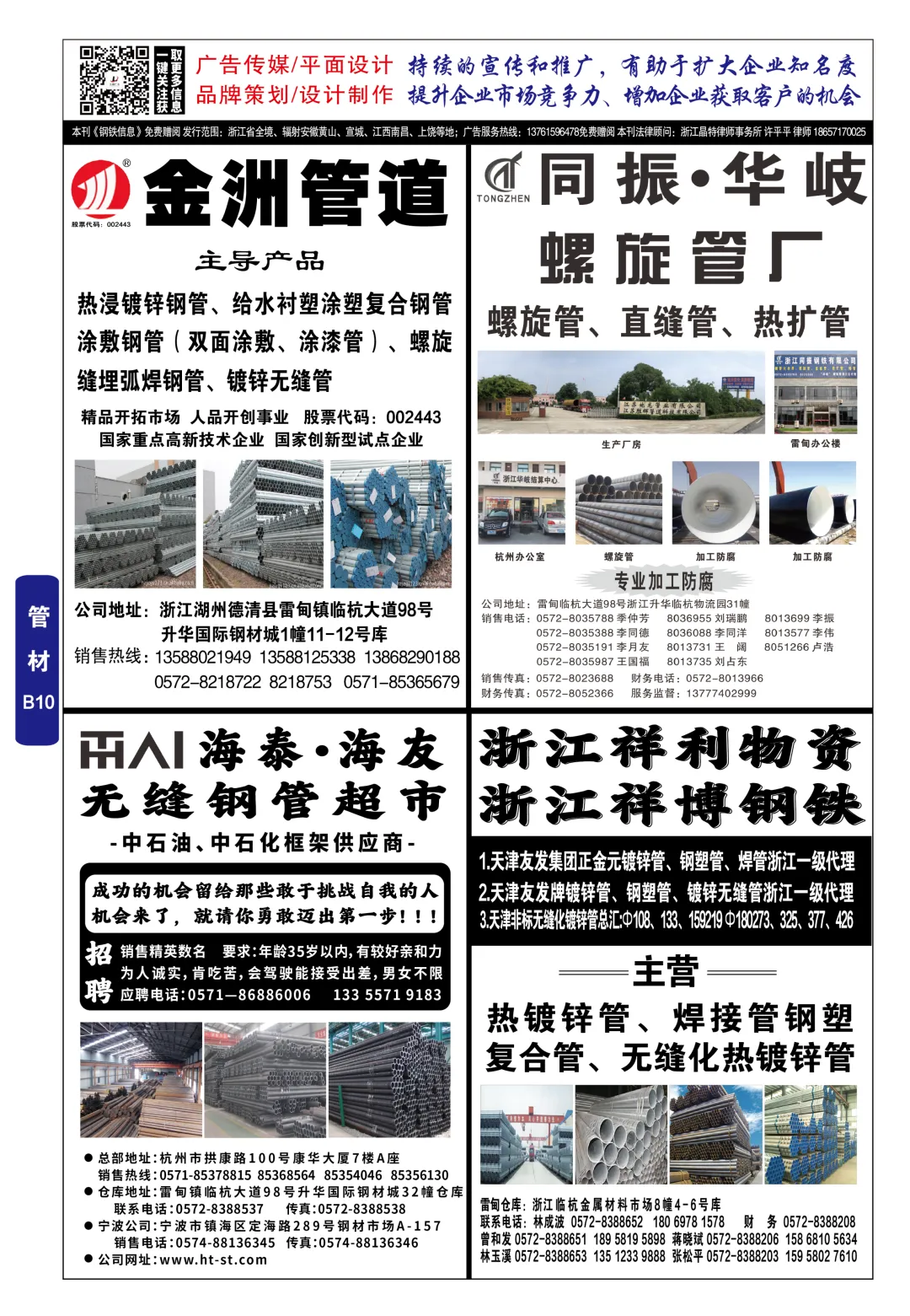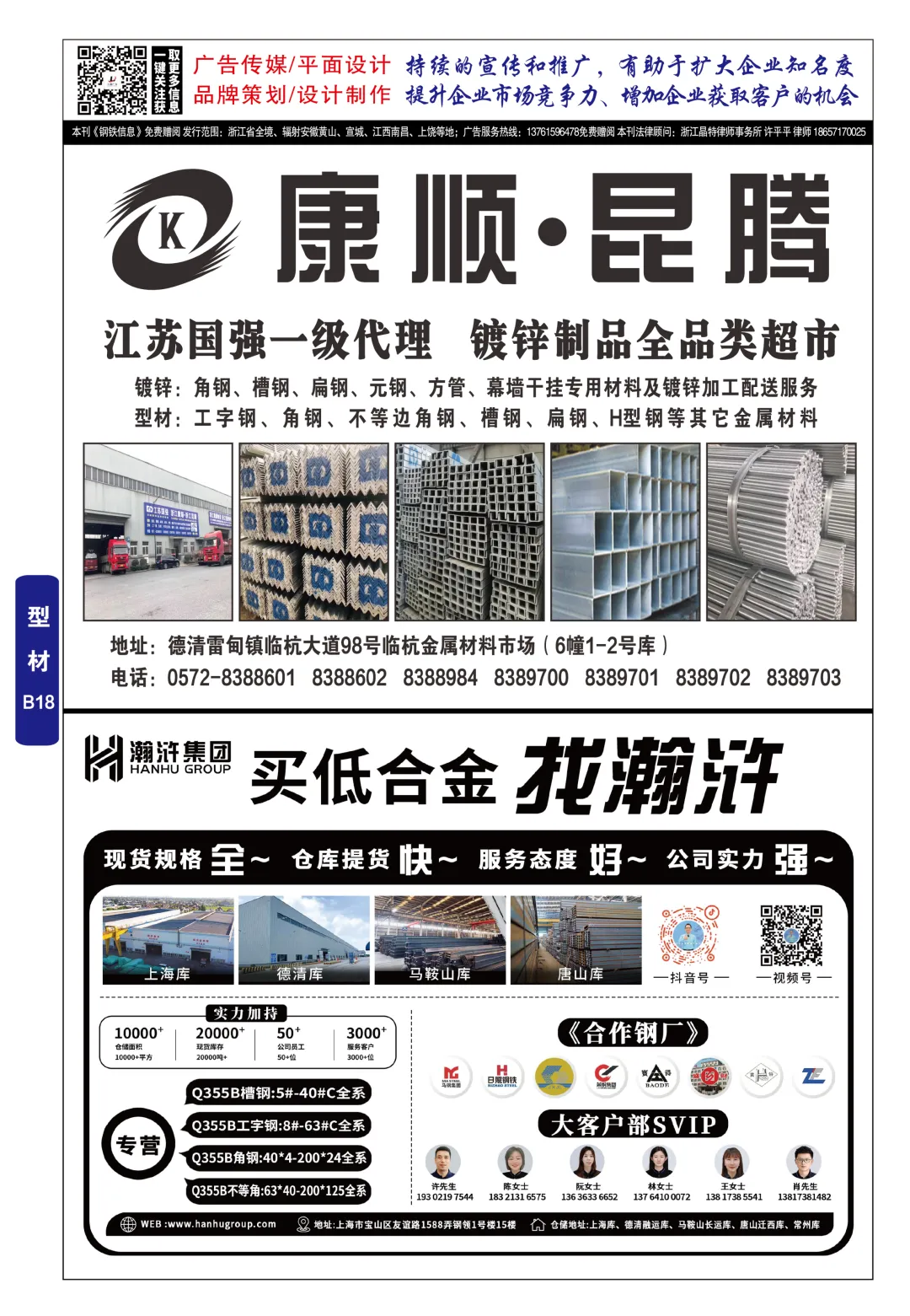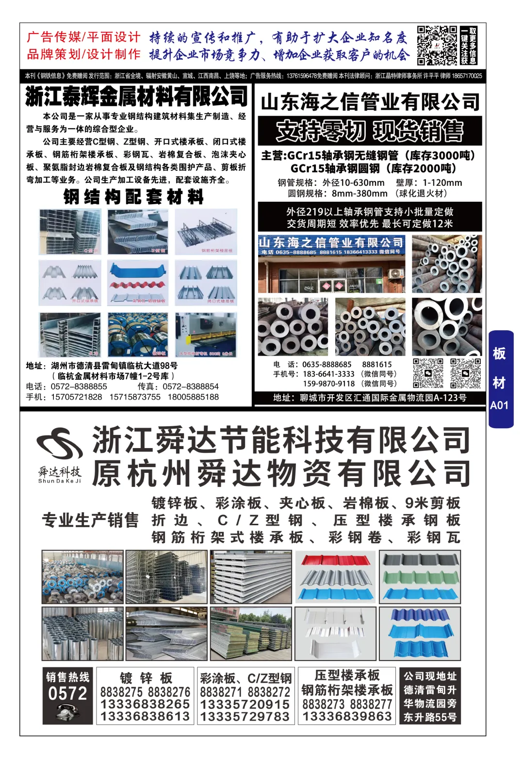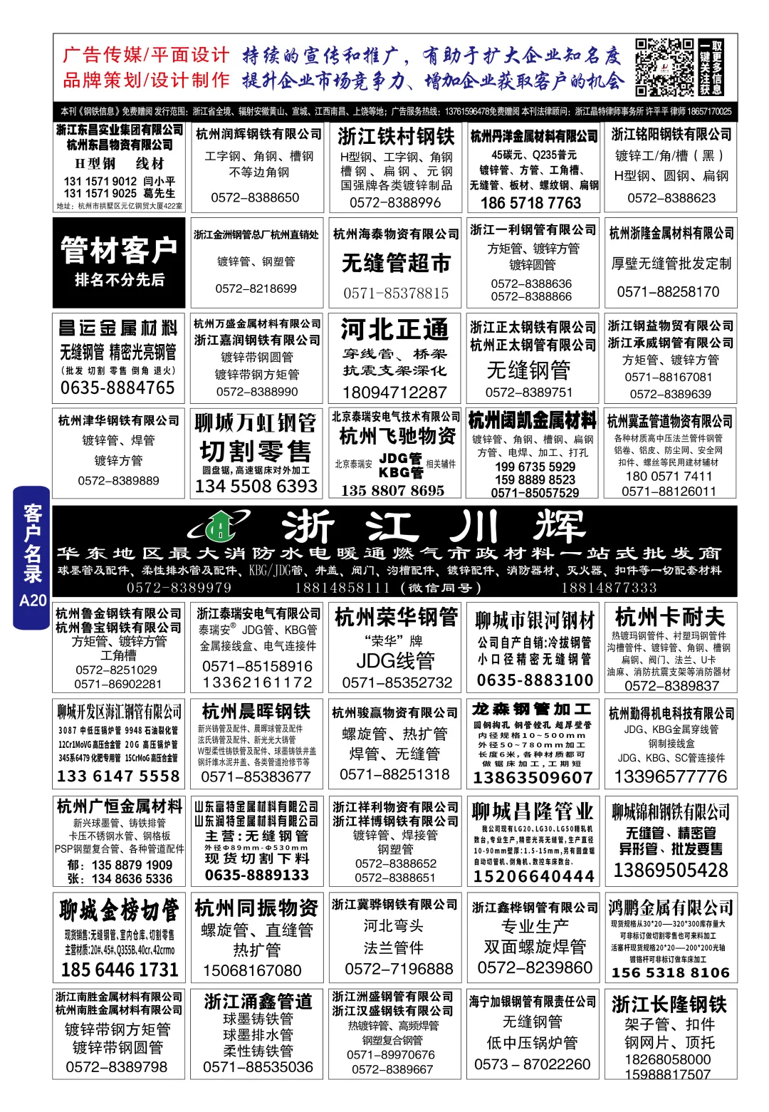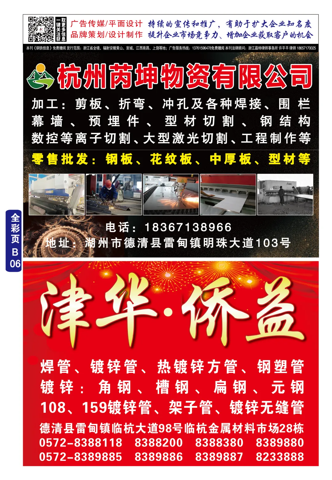 《钢铁信息》DM纸媒广告,主要是针对钢铁行业发行的一本刊物。主要以钢材信息广告资源信息、钢市信息、剪切加工配送、物流运输、仓库面门出租转让、招聘求职信息等内容为主,是一款内容较为丰富实用性较强的功能型报刊。我们所提供合作的每一家供应商都是浙江地区具有一定实力和规模的优质企业,各类钢材品种齐全,真实有效。为买卖钢及相关行业用钢需求提供了方便真实的信息服务。多年来,深受广大买卖商家的青睐