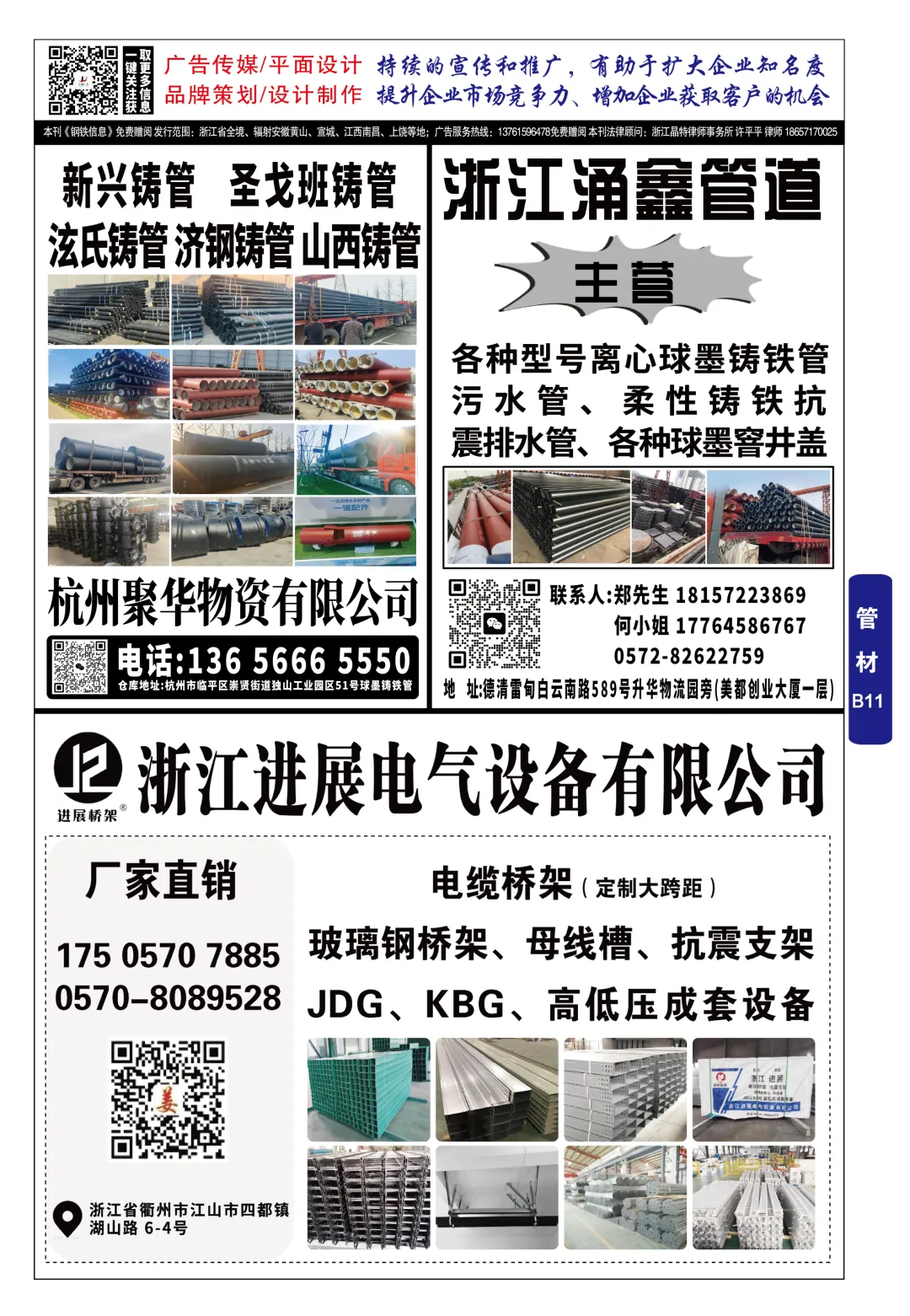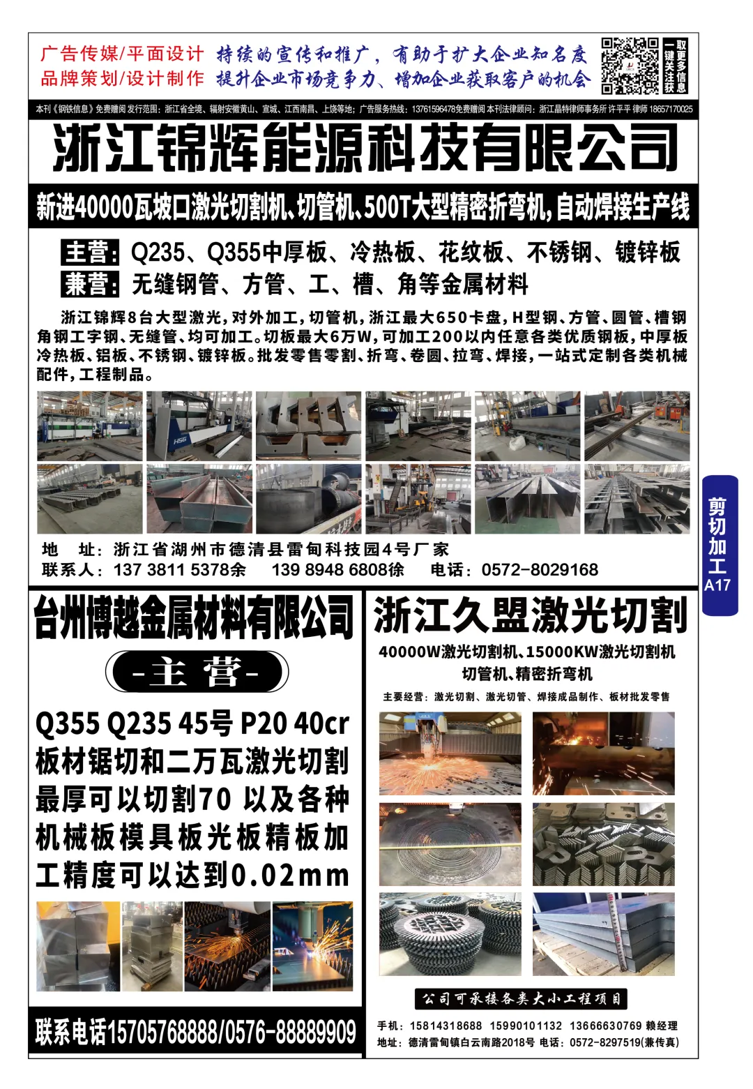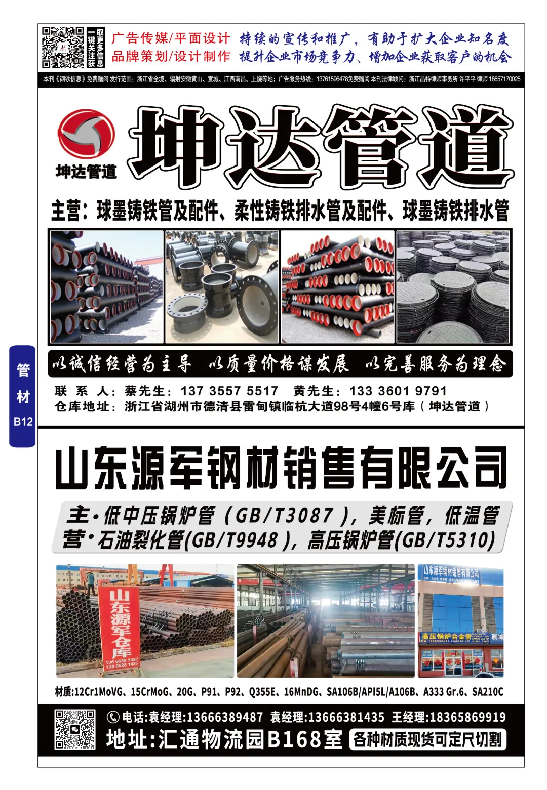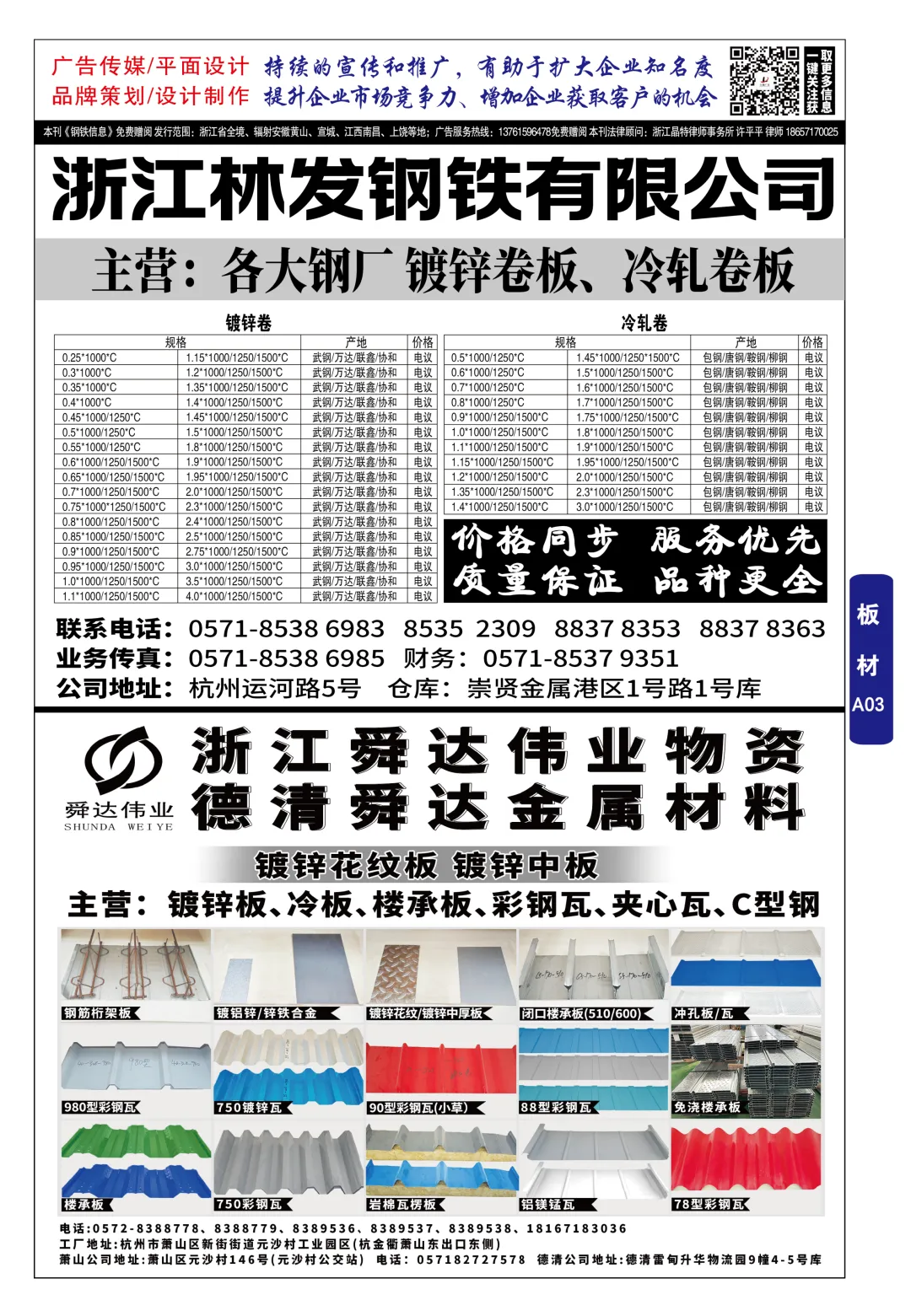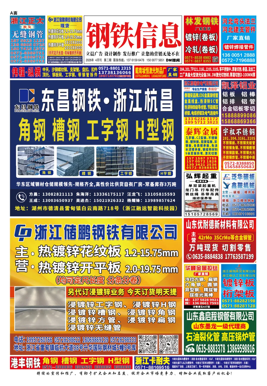 《钢铁信息》DM纸媒广告,主要是针对钢铁行业发行的一本刊物。主要以钢材信息广告资源信息、钢市信息、剪切加工配送、物流运输、仓库面门出租转让、招聘求职信息等内容为主,是一款内容较为丰富实用性较强的功能型报刊。我们所提供合作的每一家供应商都是浙江地区具有一定实力和规模的优质企业,各类钢材品种齐全,真实有效。为买卖钢及相关行业用钢需求提供了方便真实的信息服务。多年来,深受广大买卖商家的青睐