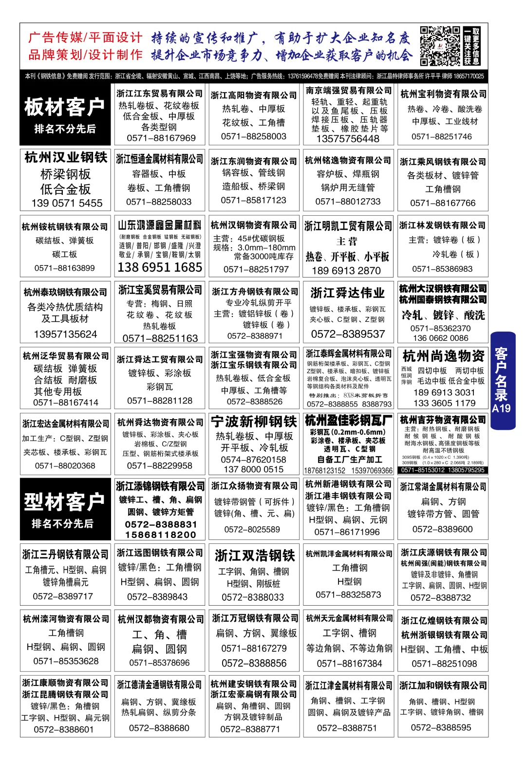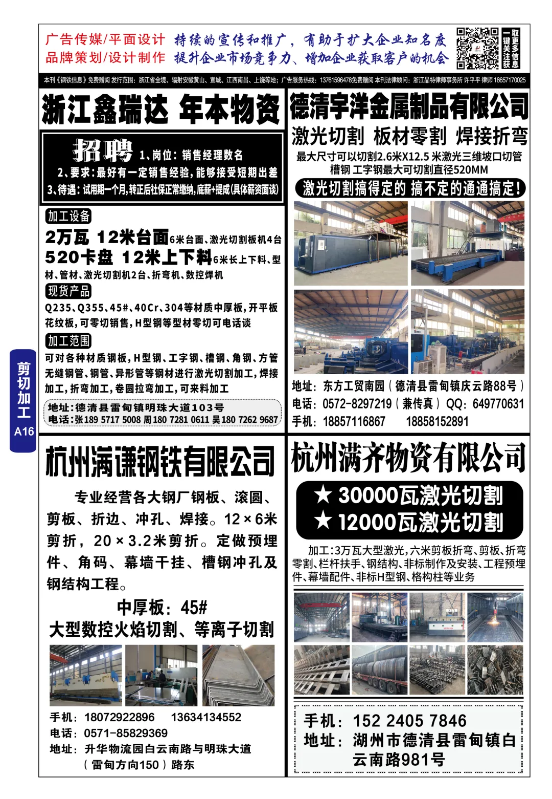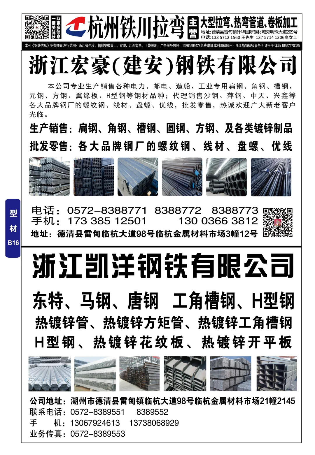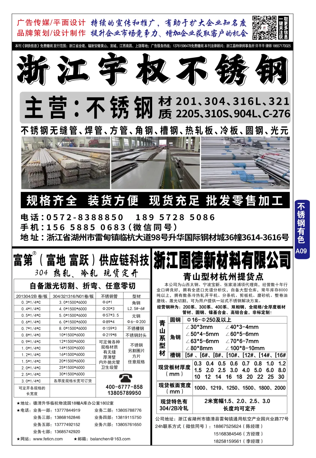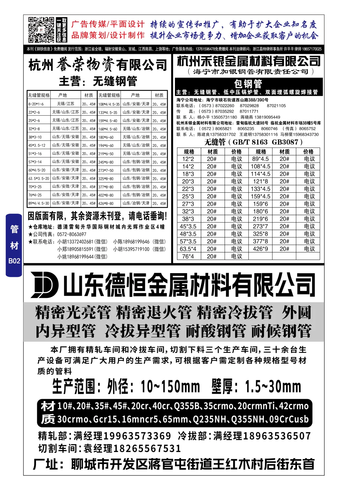 《钢铁信息》DM纸媒广告,主要是针对钢铁行业发行的一本刊物。主要以钢材信息广告资源信息、钢市信息、剪切加工配送、物流运输、仓库面门出租转让、招聘求职信息等内容为主,是一款内容较为丰富实用性较强的功能型报刊。我们所提供合作的每一家供应商都是浙江地区具有一定实力和规模的优质企业,各类钢材品种齐全,真实有效。为买卖钢及相关行业用钢需求提供了方便真实的信息服务。多年来,深受广大买卖商家的青睐