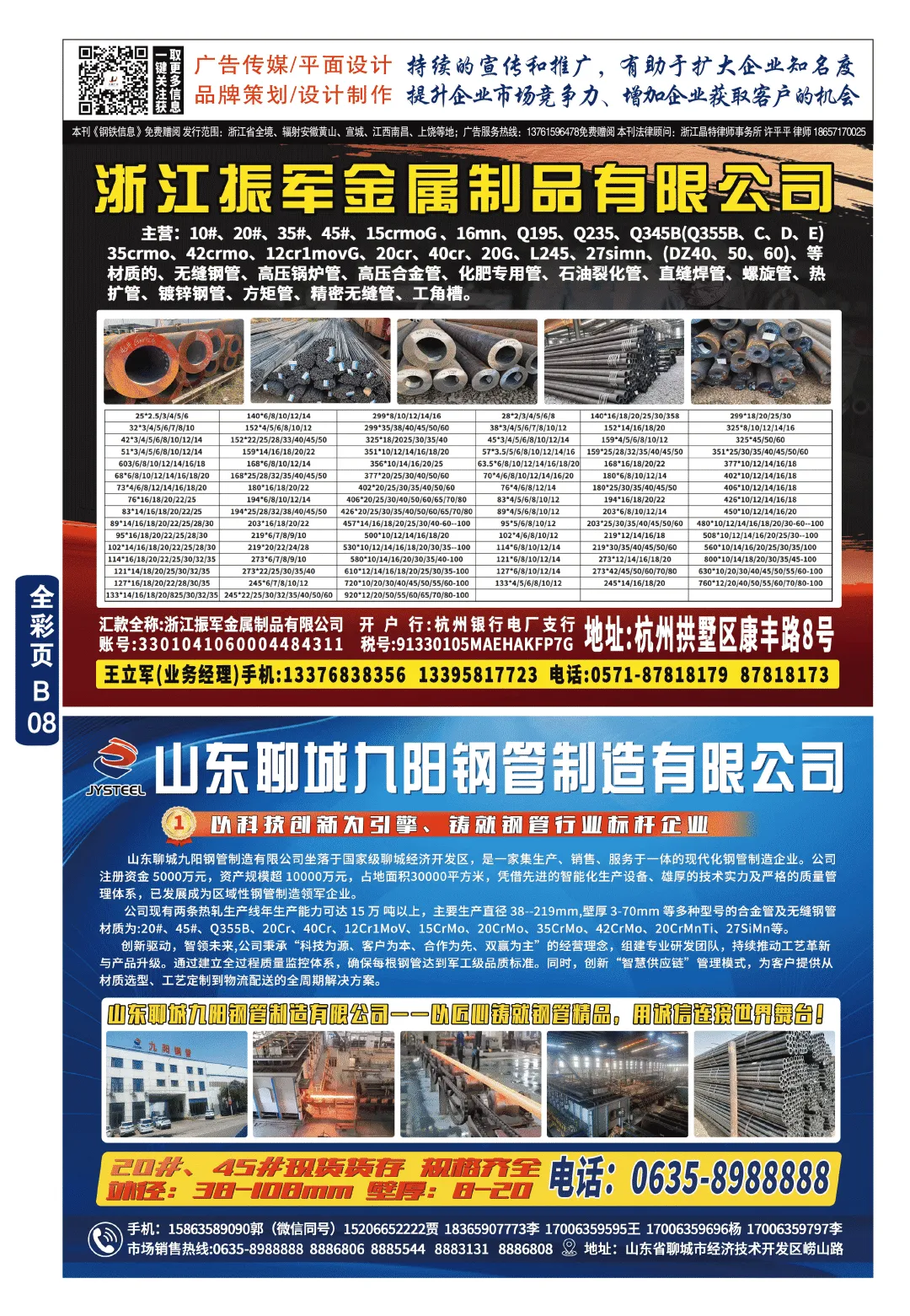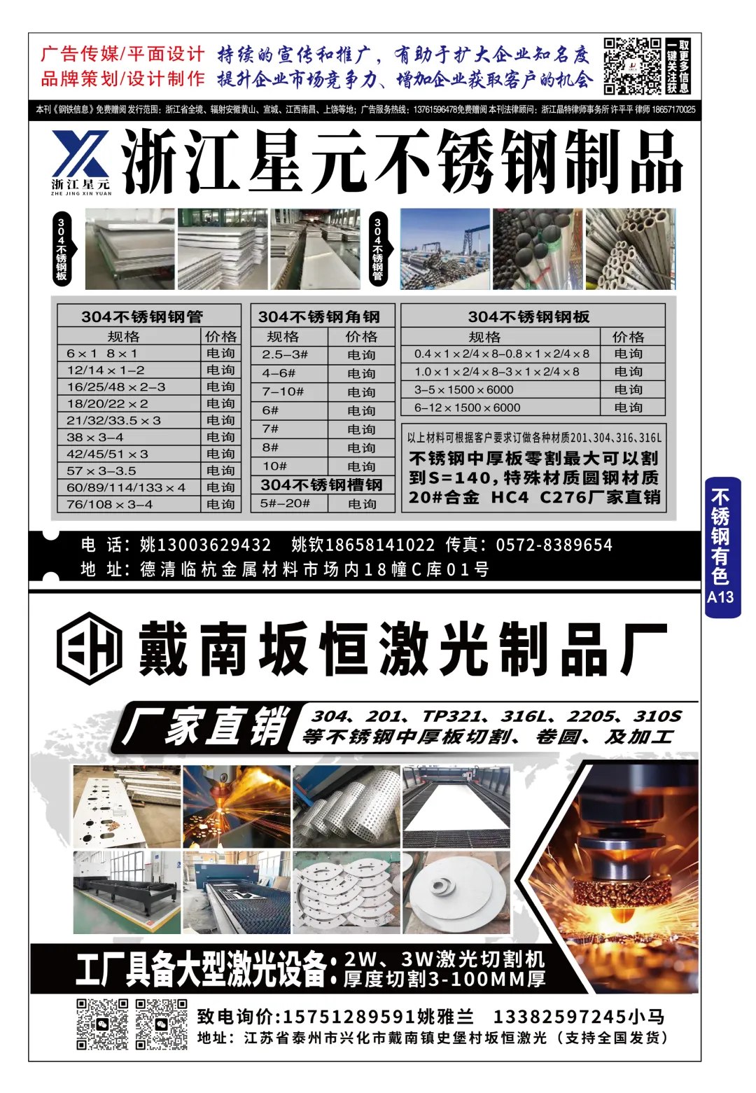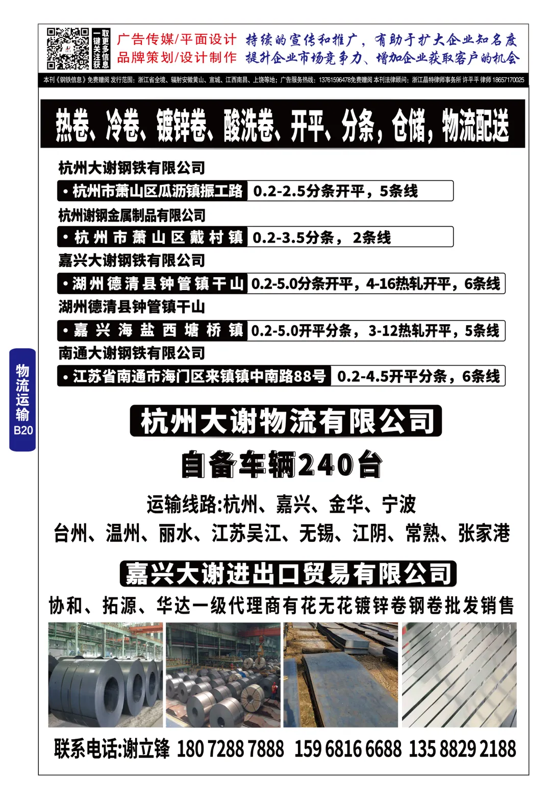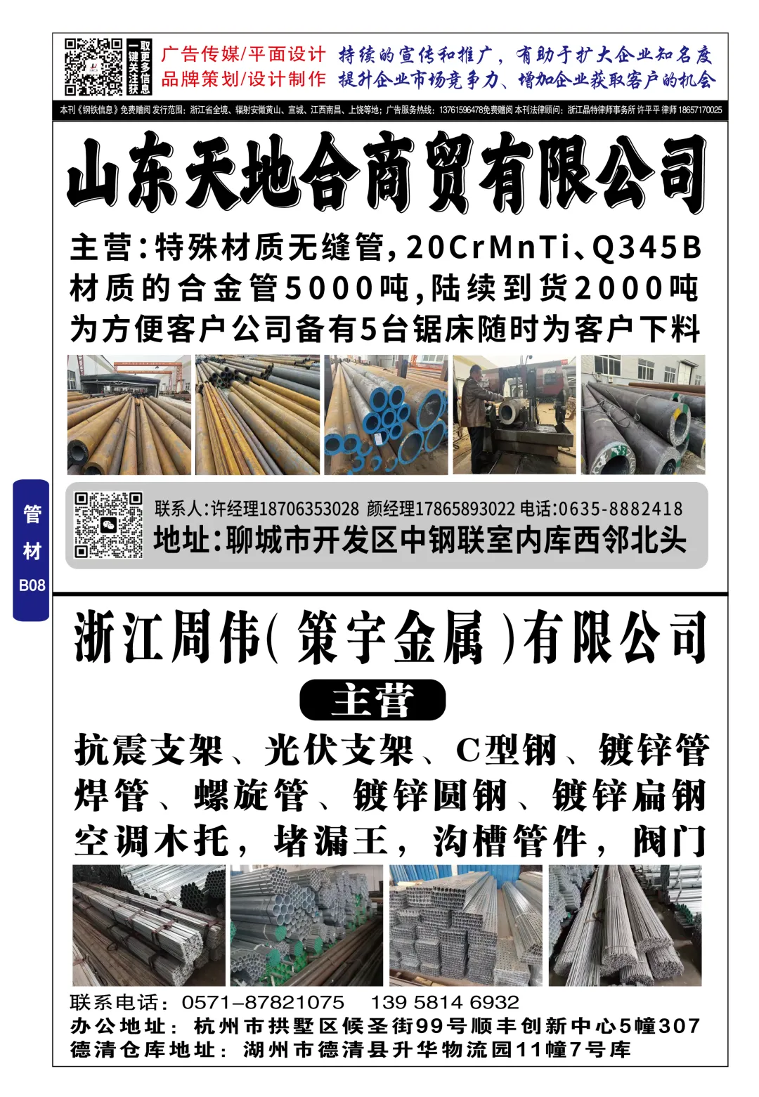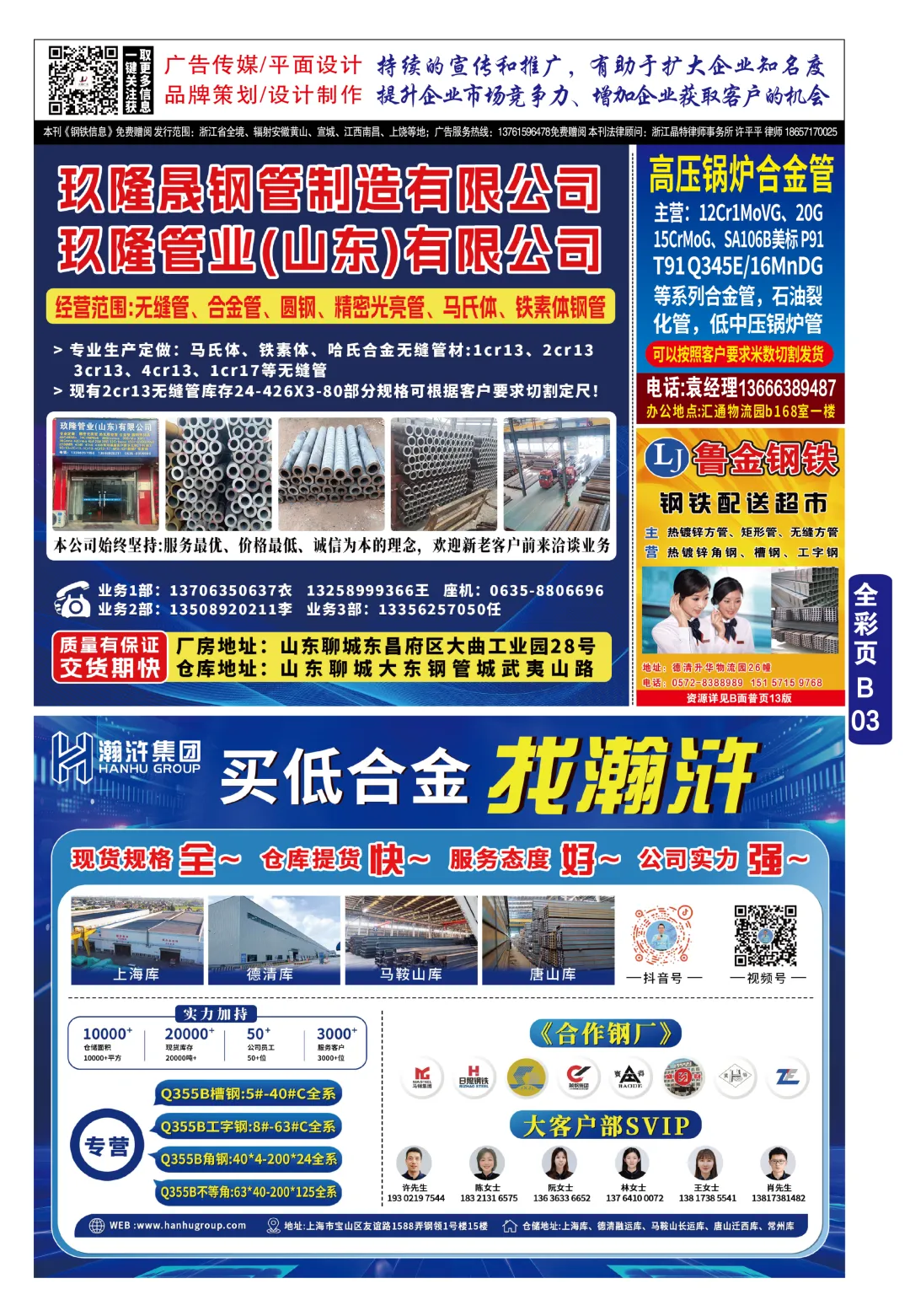 《钢铁信息》DM纸媒广告,主要是针对钢铁行业发行的一本刊物。主要以钢材信息广告资源信息、钢市信息、剪切加工配送、物流运输、仓库面门出租转让、招聘求职信息等内容为主,是一款内容较为丰富实用性较强的功能型报刊。我们所提供合作的每一家供应商都是浙江地区具有一定实力和规模的优质企业,各类钢材品种齐全,真实有效。为买卖钢及相关行业用钢需求提供了方便真实的信息服务。多年来,深受广大买卖商家的青睐