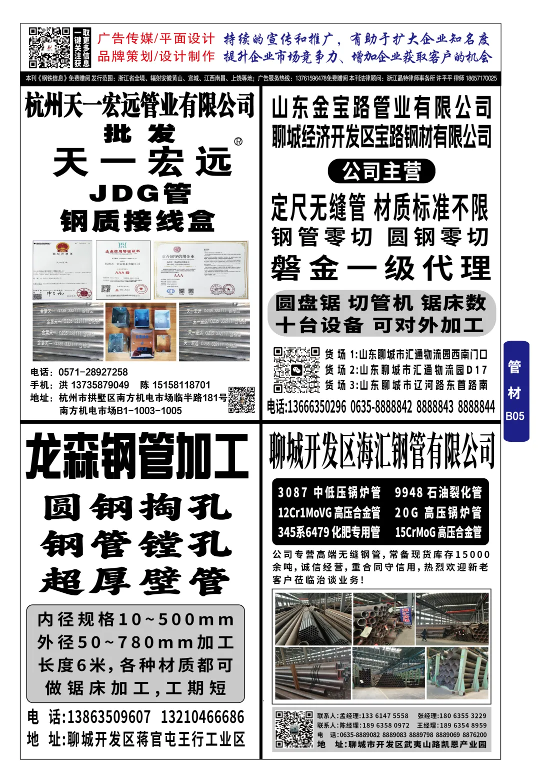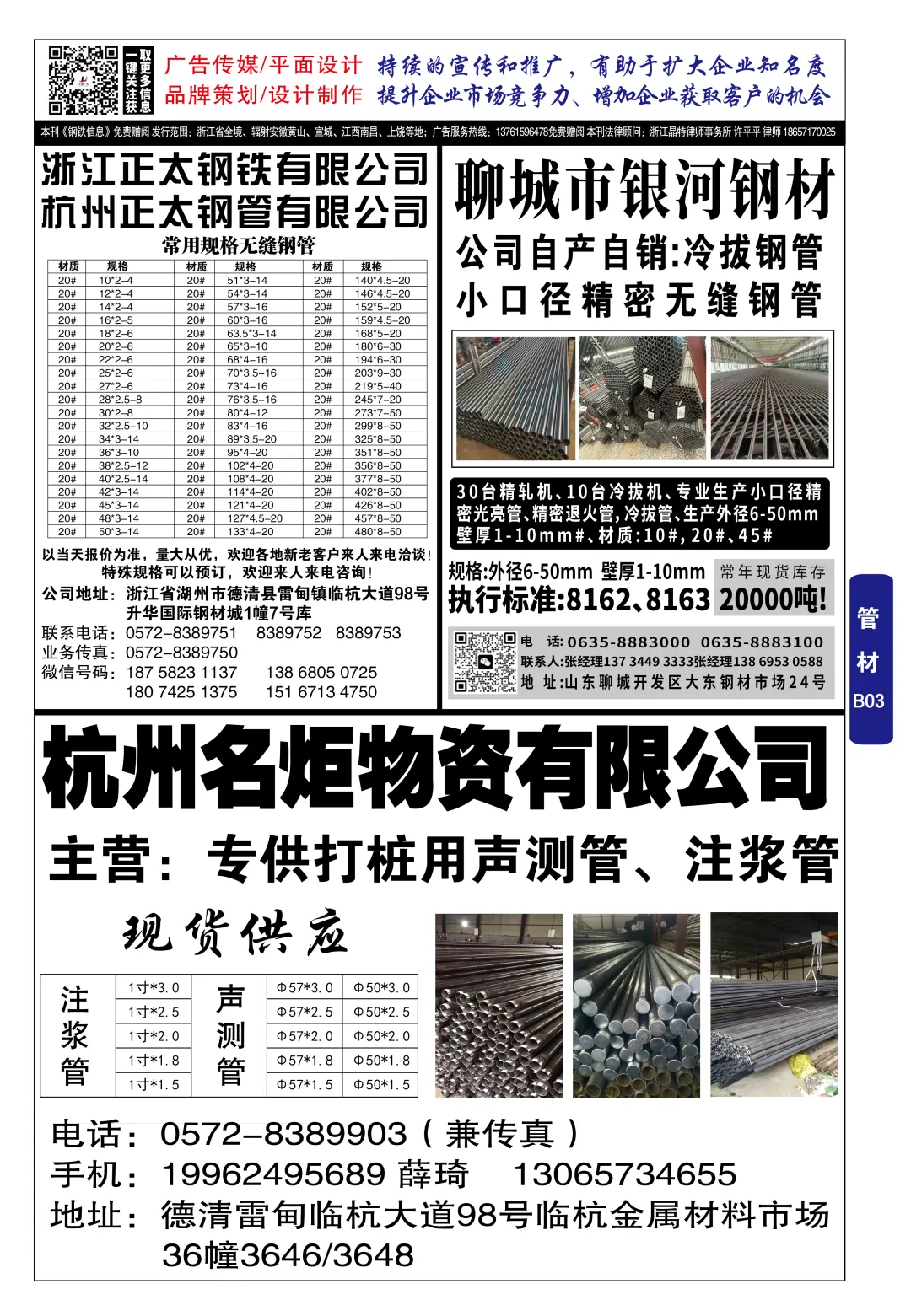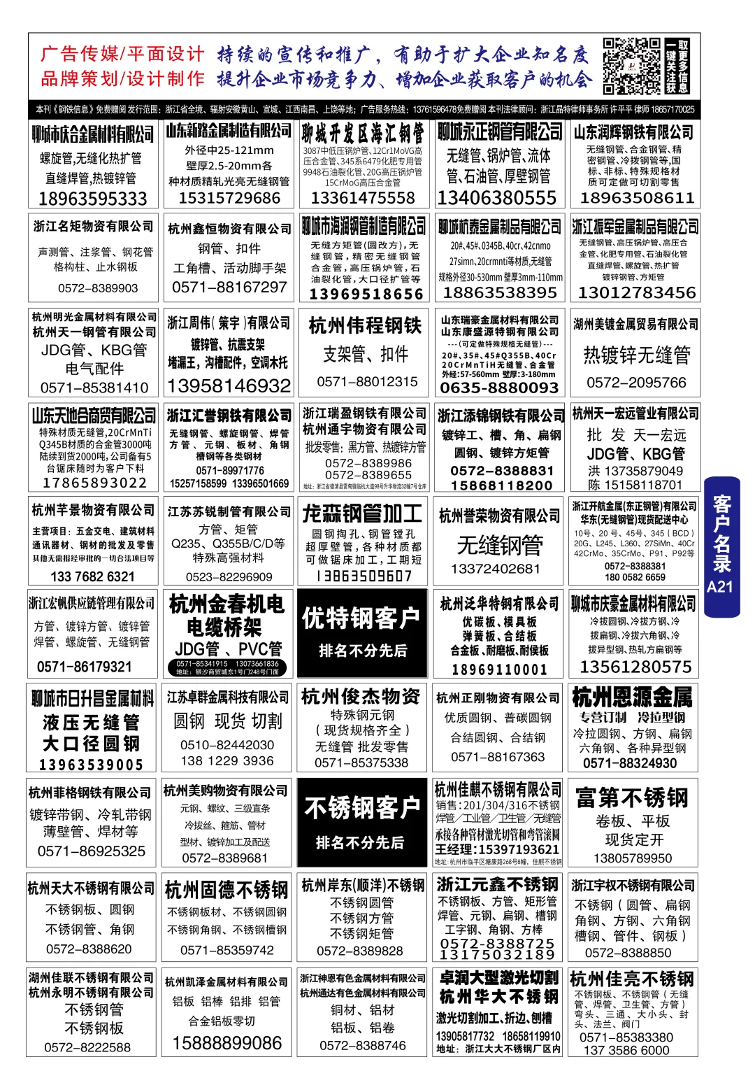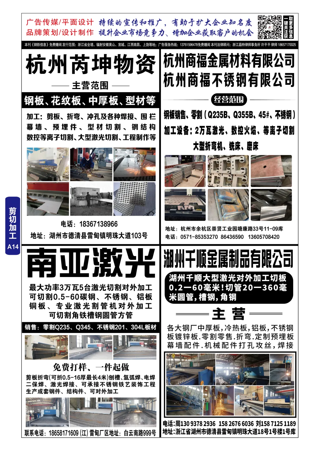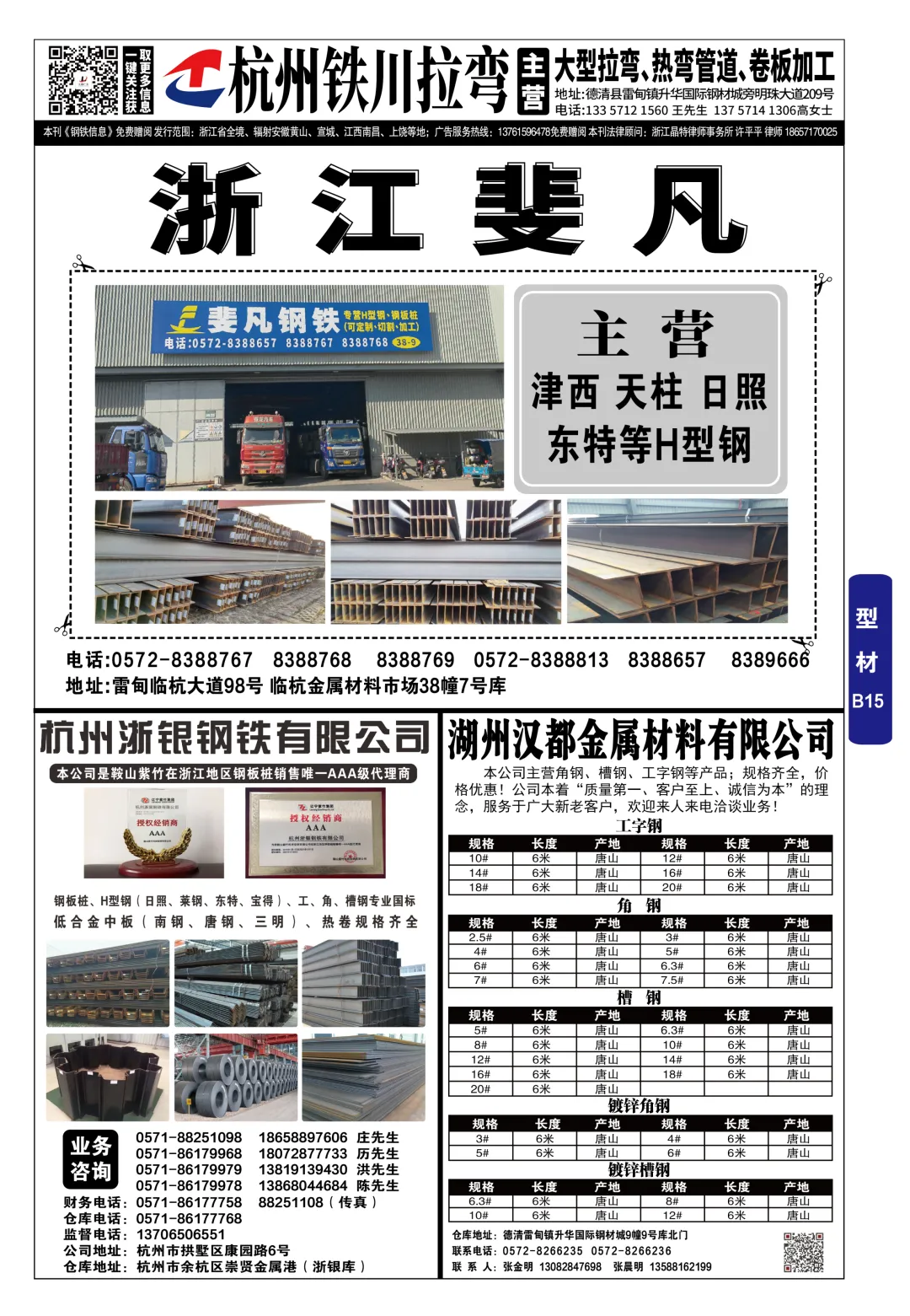 《钢铁信息》DM纸媒广告,主要是针对钢铁行业发行的一本刊物。主要以钢材信息广告资源信息、钢市信息、剪切加工配送、物流运输、仓库面门出租转让、招聘求职信息等内容为主,是一款内容较为丰富实用性较强的功能型报刊。我们所提供合作的每一家供应商都是浙江地区具有一定实力和规模的优质企业,各类钢材品种齐全,真实有效。为买卖钢及相关行业用钢需求提供了方便真实的信息服务。多年来,深受广大买卖商家的青睐
