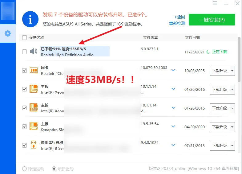 驱动库挺全的,常见的显卡声卡网卡这些基本都能覆盖到,而且下载不限速,这一点跟很多同类工具比起来,差距还是比较明显的,那种龟速下载的煎熬感,在这里是没有的。我这边测试了一下,一下就去到50几MB/s,速度还是可以的。