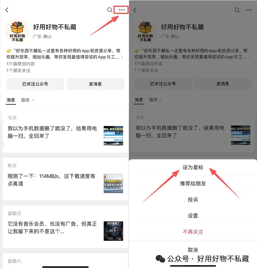 小伙伴们注意:好用每天都定时更新,但因为信息流乱序,不少人还是错过了干货!好用建议大家把本公众号置顶(设为星标★),以便及时看到推送,方法如下图: