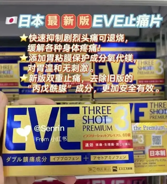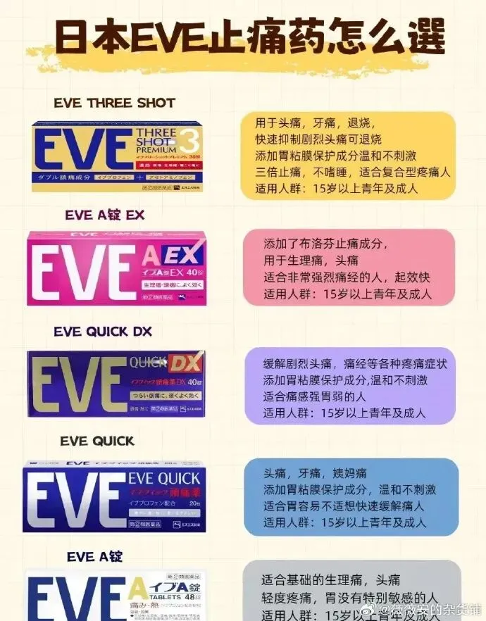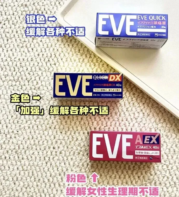 • EVE A锭(白色盒子):基础款,布洛芬含量较低(通常150mg),适合轻中度疼痛。