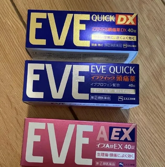 • EVE DX(蓝色盒子):含有布洛芬(150mg)、丙戊酰脲和无水咖啡因,是销量最好的版本,适合各种头痛、牙痛、痛经。• EVE QUICK DX(蓝色盒子,有“Quick”字样):布洛芬含量较高(200mg),并添加了酸化剂使药片更易崩解吸收,号称起效更快。