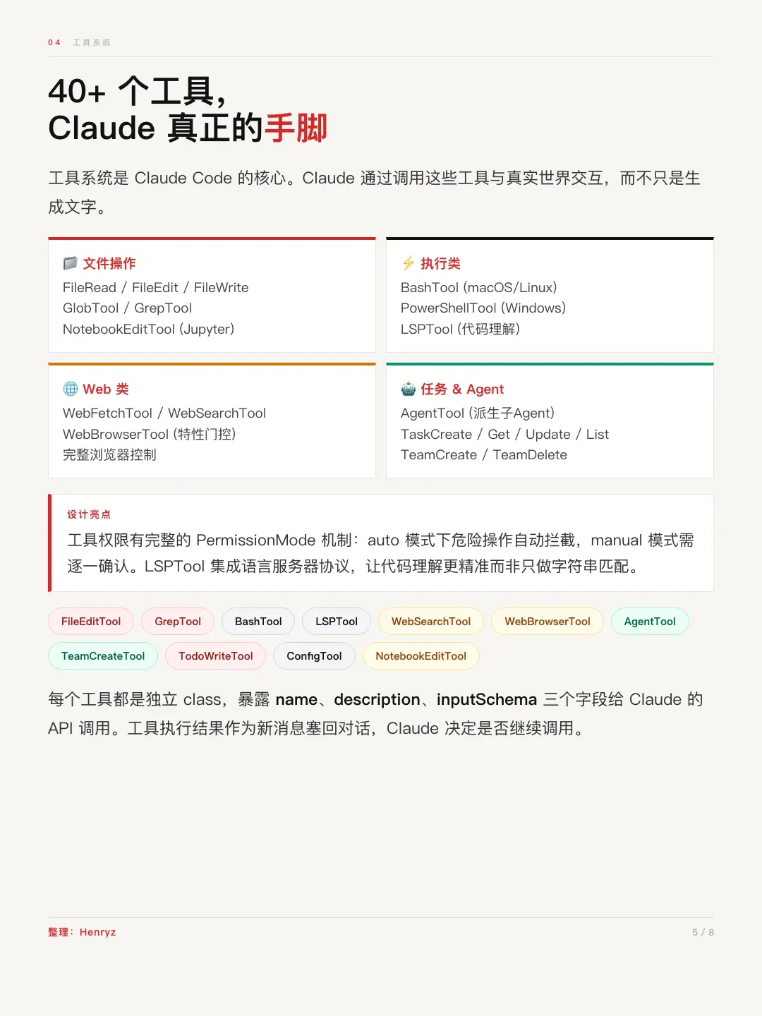 第三,内置了四十多个工具,文件操作、执行命令、网页搜索、语言服务全都有。每个工具都是独立类,Claude 自己决定调用哪个,结果返回后再继续下一步。