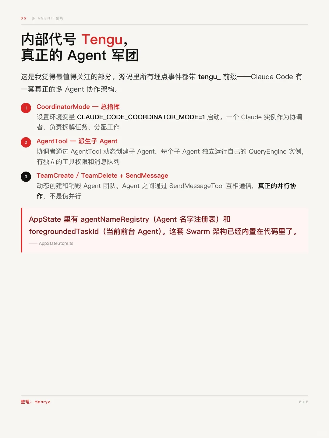 第四,藏着一套完整的多 Agent 架构,代号 Tengu。源码里全是 tengu_ 开头的埋点,一个主 Claude 当指挥,动态派生子 Agent 并行干活,还能互相通信,这不是 demo,是真写进代码里了。