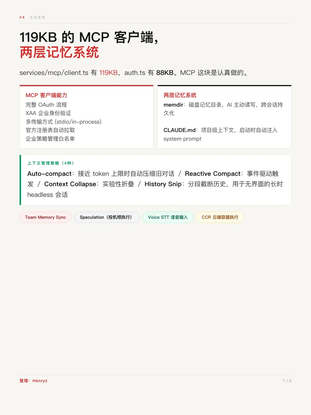 第五,MCP 客户端做得很精致。协议实现只有 119KB,认证模块 88KB,却完整支持 OAuth、企业登录、自动拉取注册表,看得出来是认真打磨过的。