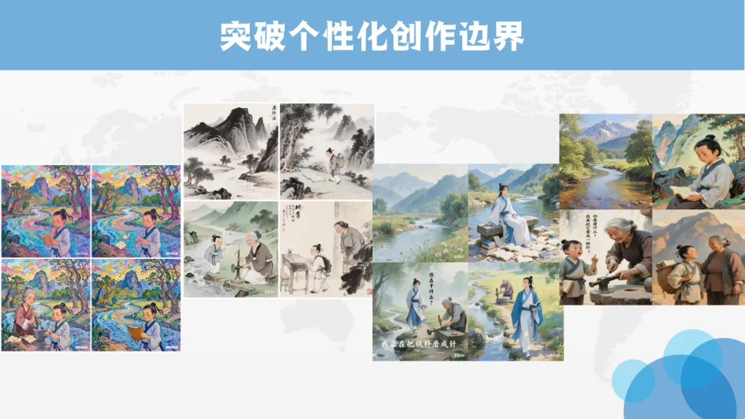 以往学《铁杵成针》,我总会让孩子想象老媪磨针的场景,再写下来、画下来。可有的孩子擅长想象,不擅长表达;有的孩子心里有画面,笔下却画不出。一节课短短40分钟,我根本顾不上每个人。这一次,孩子们只需把自己的想法写成简单的提示词,AI就能瞬间生成专属插画。有人画了山间小溪,有人画了白发老婆婆,有人画了年少的李白——同样一篇课文,却长出了几十种不一样的画面。