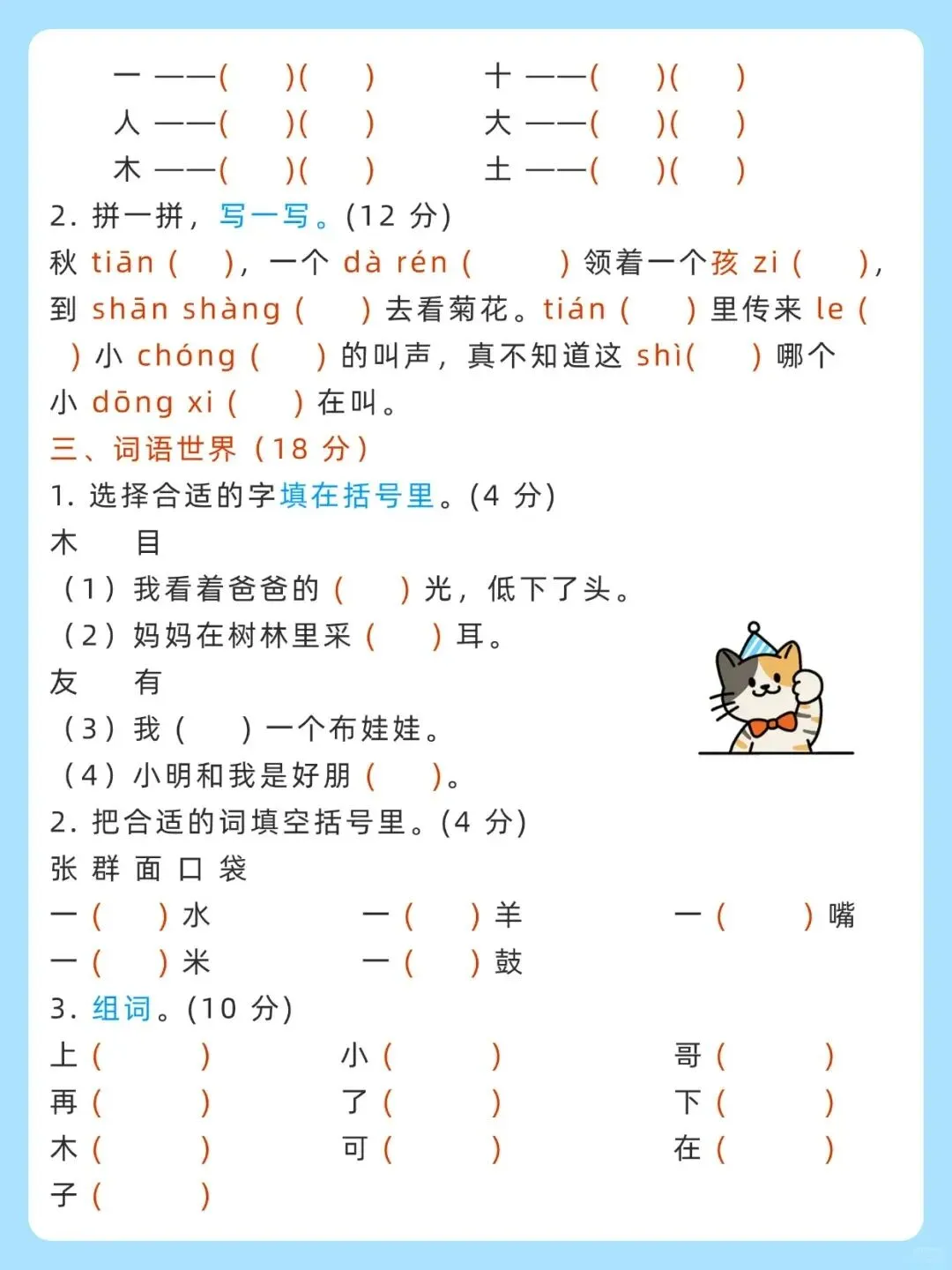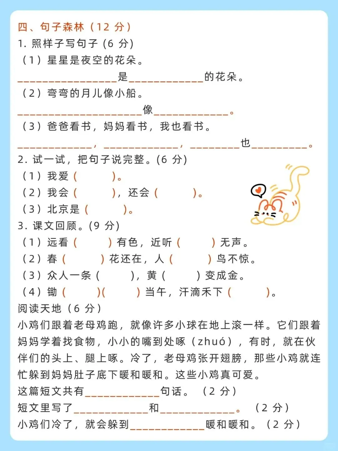 | 包含拼音分类、韵母补充、音节拼读、生字变新字、看拼音写词语、形近字填空、量词运用、组词、句子仿写、课文回顾、简单阅读和看图写话等全面题型,附带完整答案解析,可快速检测孩子拼音、生字、词语、句子的掌握情况,精准查漏补缺,做好学前语文能力验收。 |