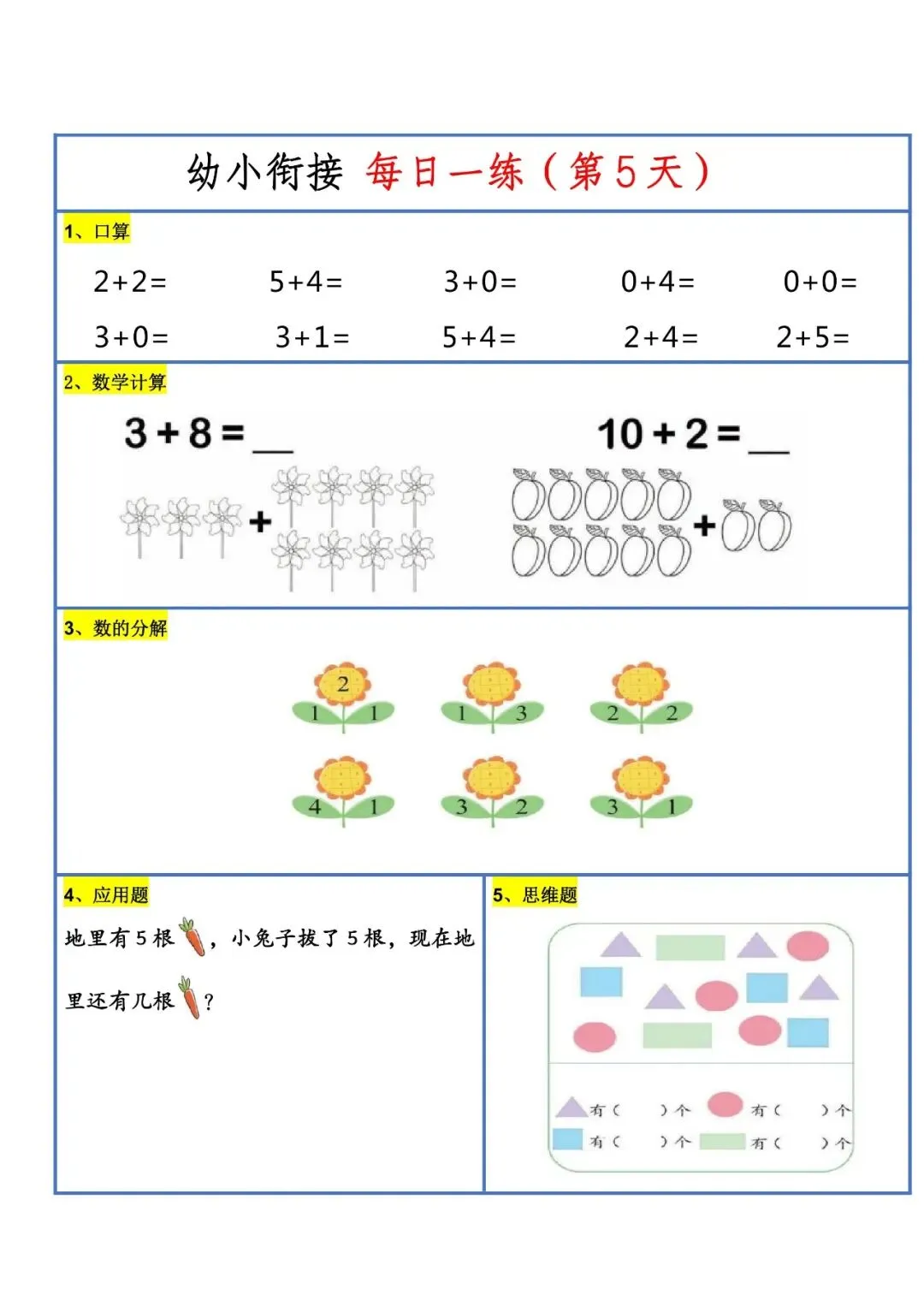 | 每天包含口算、基础计算、数的分解与规律、比大小、看图列式、简单应用题和思维拓展题,覆盖 10-20 以内加减法、数字排序、重量比较、图形计数等核心考点,题型由浅入深、题量适中,帮助孩子每日巩固计算能力、培养数感与数学思维,平稳过渡小学。 |