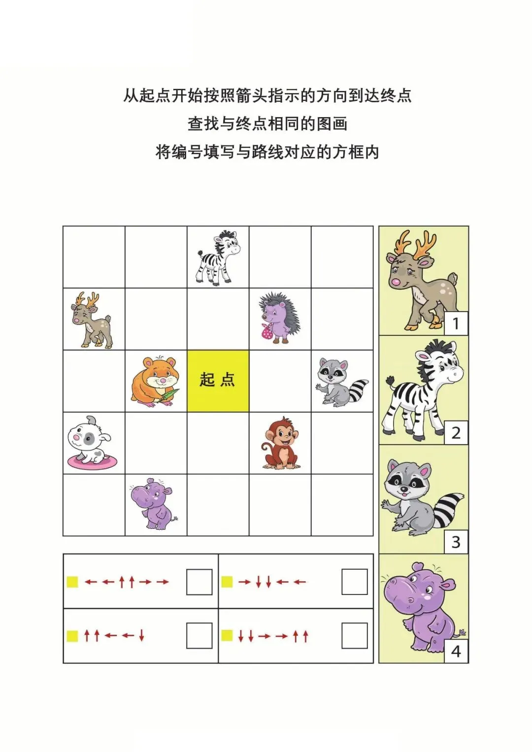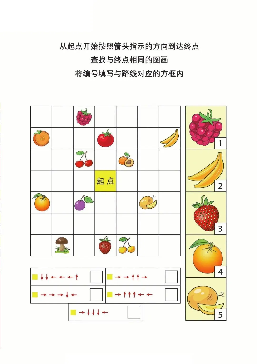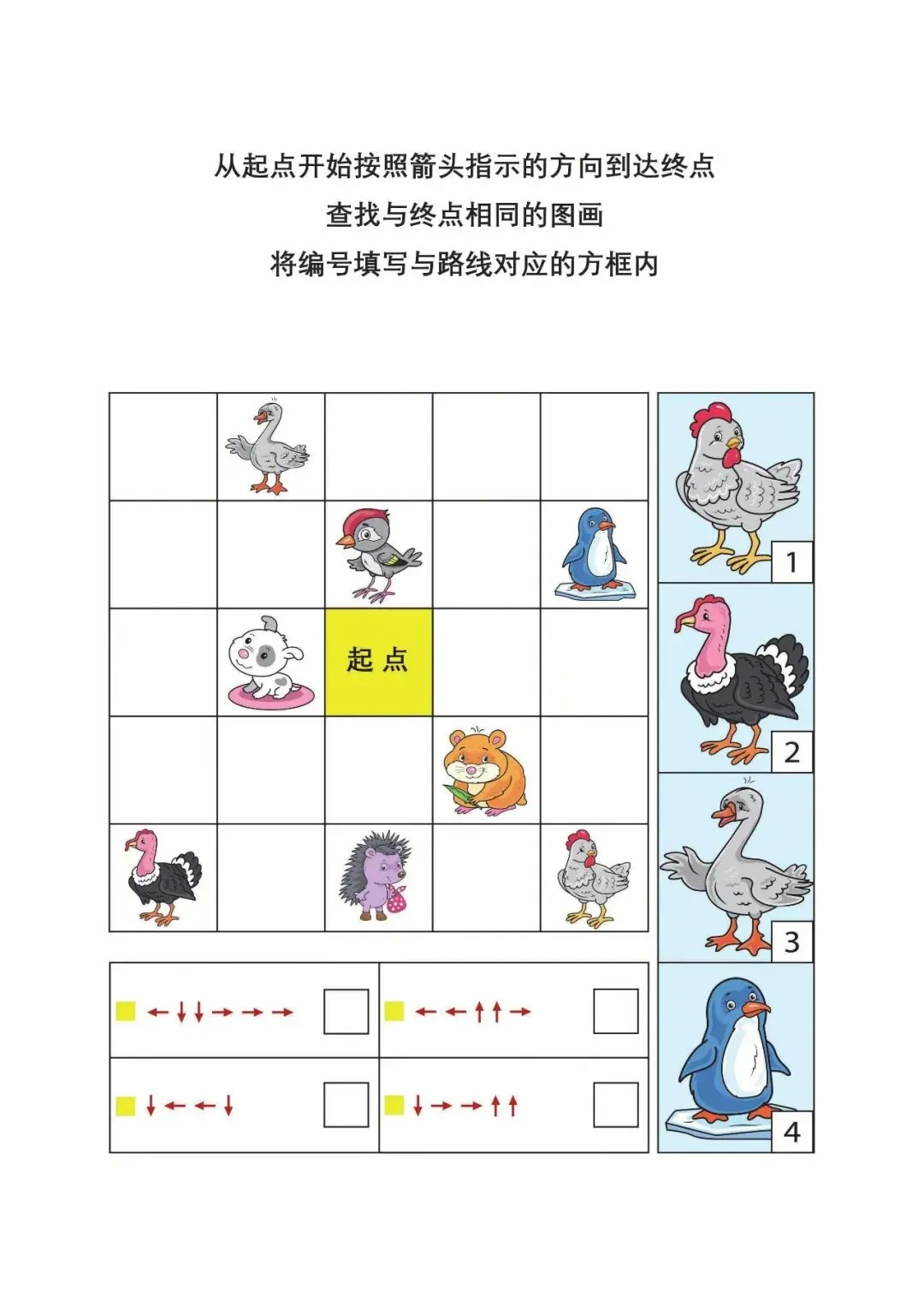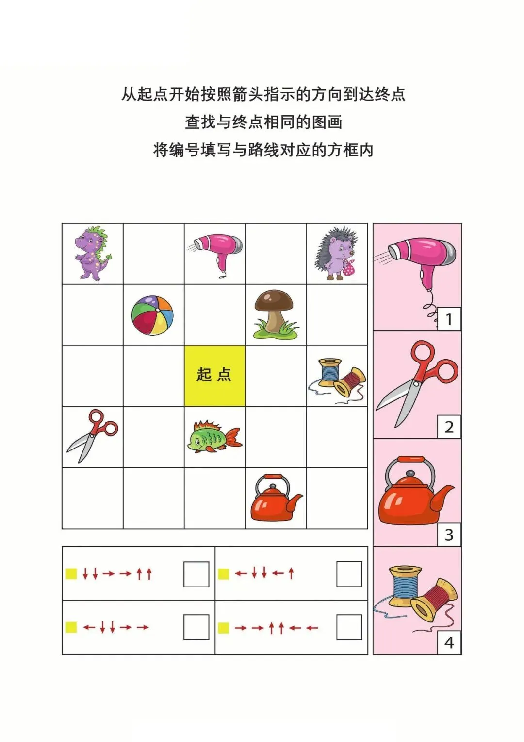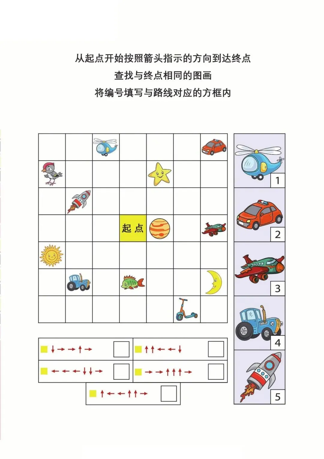 | 资料以箭头路线为核心,让孩子按指示从起点找到终点,并匹配对应图画编号,题型简单有趣,既能锻炼视觉追踪、方向判断与逻辑对应能力,又能培养耐心和观察力,适合幼小衔接阶段孩子进行专注力与思维训练,轻松提升学习基础能力。 |