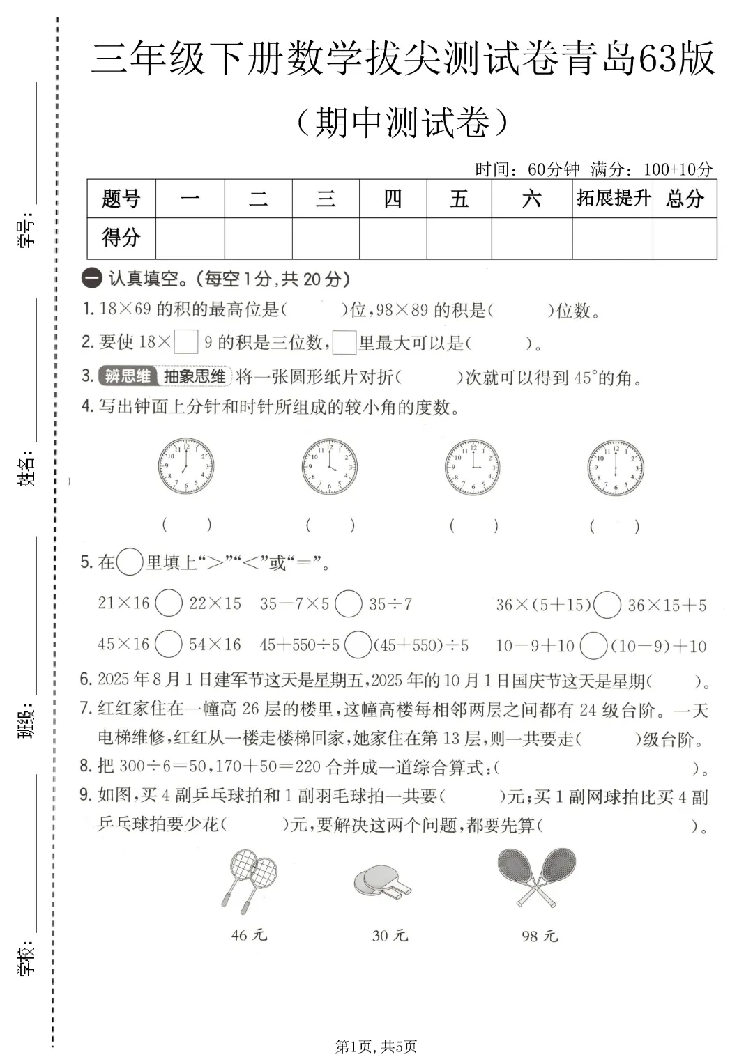 嗨!今日分享2026年春青岛版63版《三年级下册数学期中测试卷达(拔尖测试卷)有答案》电子版可下载打印。