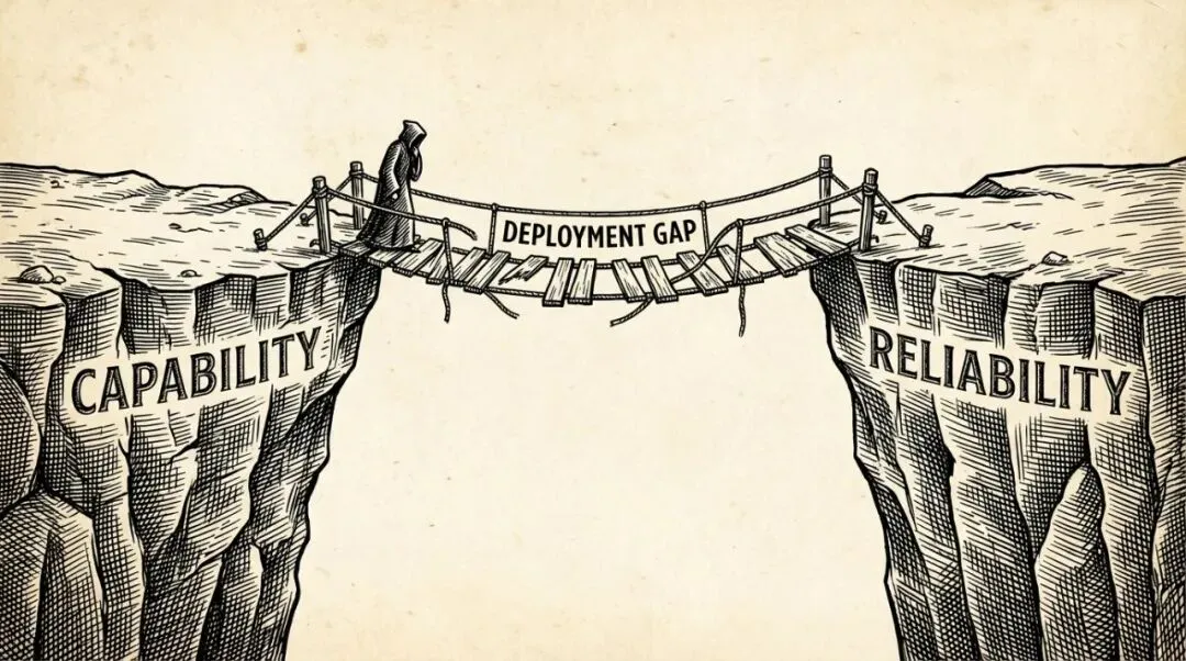 这不是在否认能力进步。能力进步是真实的、惊人的、快速的。但能力和可靠性之间有一条鸿沟——我叫它部署鸿沟——这条鸿沟的宽度决定了技术什么时候真正改变世界,而不只是在演示视频里改变世界。