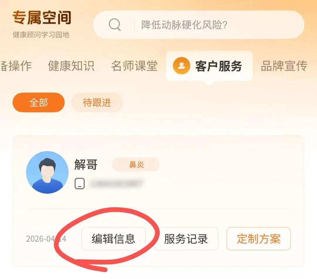 在“专属—客户服务”菜单下,新增客户“编辑信息”,为客户补充智能健康档案信息。