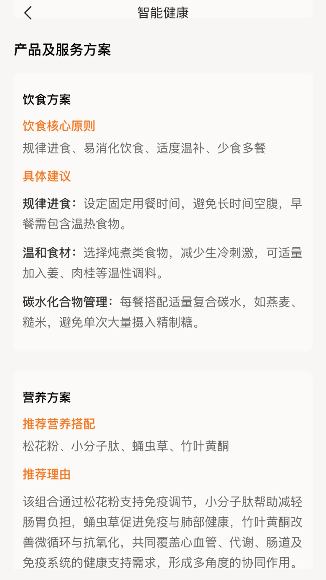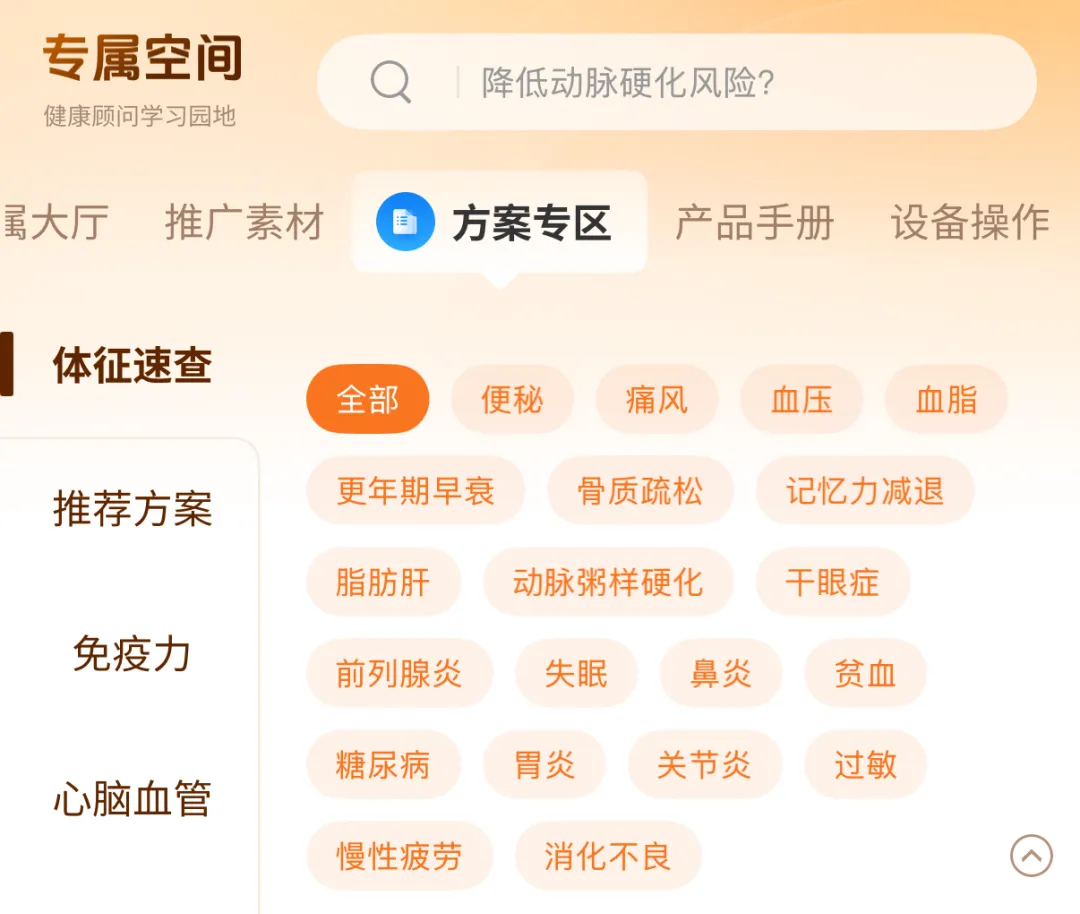 “专属—方案专区”增设“体征速查”板块,针对常见健康问题与慢性症状,给出科学的营养补充、生活调理的综合建议。