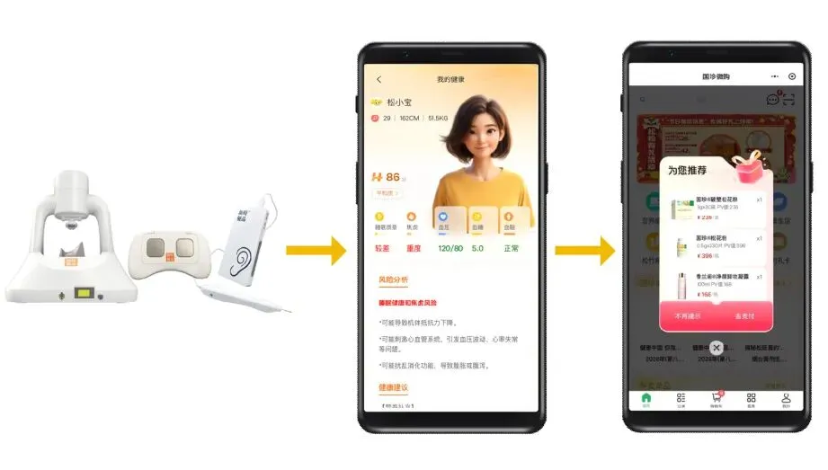 现在,健康顾问用客户的手机号登录脉诊仪、耳穴仪等设备,给客户做完监测→3—5分钟后再用同一个手机号注册或登录国珍微购→国珍微购首页就会直接弹出搭配好的产品订单,助力大家提升成交效率。