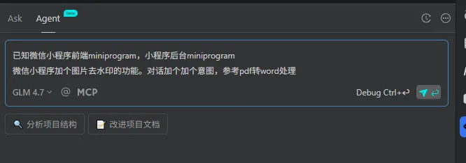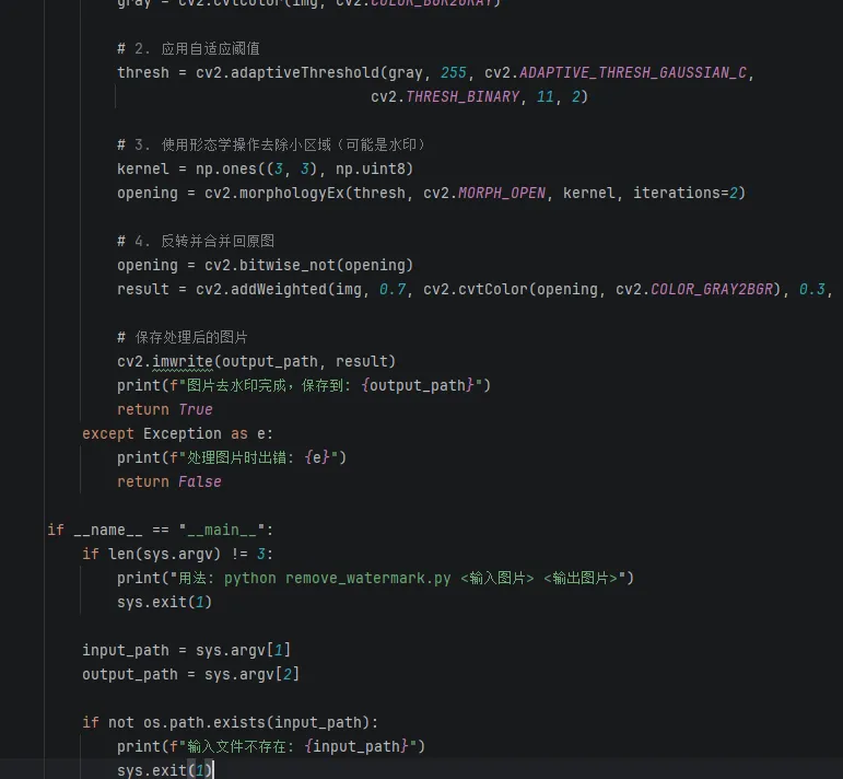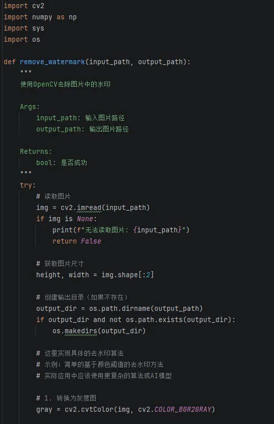 西米AI工具宝-图片去水印 今天想给自己的小程序加个图片去水印的过程,老规矩先交给AI,再改它生成的又香又臭的屎山代码。提示词就简简单单,交给他自由发挥。用不起贵的又好用的模型,白嫖的,将就这用 java就不说了。常用的写法。给的是java调pyhon脚本,这种方案,先观摩python python脚本如下 不知道啥情况,先跑起来再说。首选得安装python环境 python环境已装好。先看看效果 去水印后。 TMD又翻车了。大佬又要掀桌子了