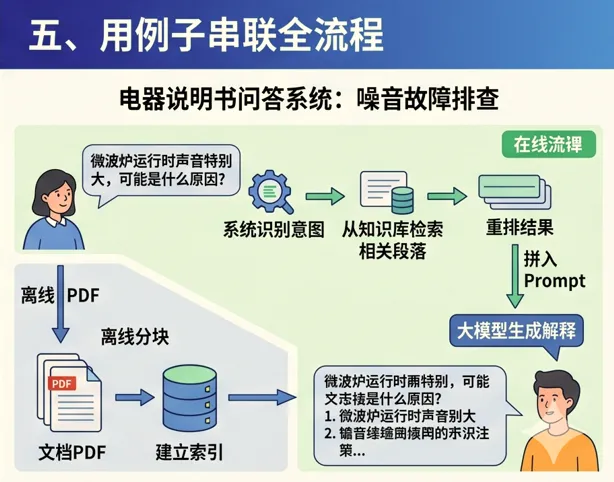 第一步,先在离线阶段把说明书 PDF 解析出来,按章节分块并建立索引。 第二步,用户提问后,系统识别“声音大”“故障”“排查”这些意图。 第三步,从知识库中检索出“噪音问题”“异常运行”“故障排除”等相关段落。 第四步,对结果重排,挑出最可能回答问题的片段。 第五步,把这些片段和用户问题拼进 Prompt。 第六步,由大模型生成一段自然语言回答。