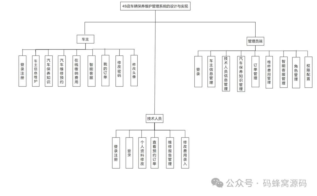 车辆保养维护管理系统包括登录、车主信息管理、技术人员管理、汽车保养知识管理、汽车维修订单管理、维修费用管理、智能客服管理模块。整个系统的功能模块设计如图 :