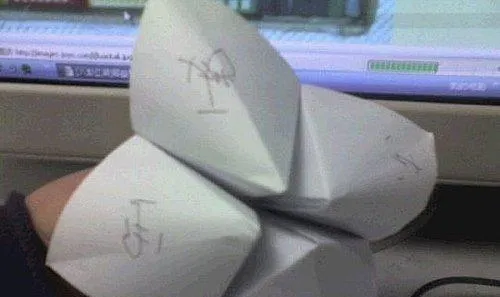 这个简陋的小机关,八零后都熟,叫折纸占卜玩具,两指撮着就能一张嘴一张合,里面写“今天运气爆棚”“挨一巴掌”“作业免写”搞笑话,放学路上就能拉着同学轮流掀一次,有人一本正经当宝贝,有人几天就撕破攒着玩,现在的孩子有手机小游戏,我们的乐趣全在一张折纸角。