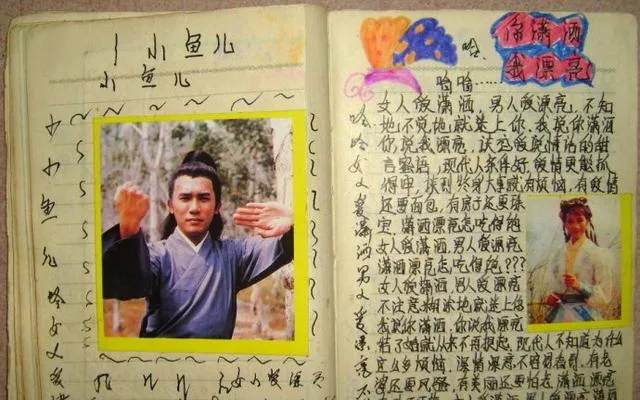 这摊开的小本子,叫武侠剪报手抄本,纯手写录的电视剧剧情,每页都贴着一角武侠人物的剧照,字丑没关系,能贴上点江湖就很得意,女同学还会画花头挤在水壶旁,背地里互传,家长总说看这些没用,可那种代入感真没人能懂,现在手机里剧情一刷一大堆,再没那种抄完整本本的韧劲。