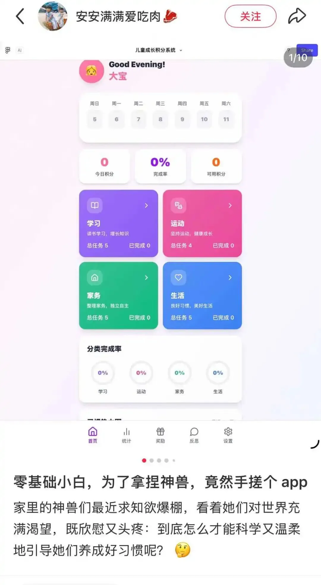 还有家长坦言是零基础小白,为孩子手搓了“儿童成长积分系统”,她说:“靠吼不如智取,既然想要量化管理,不如直接把规则系统化。”