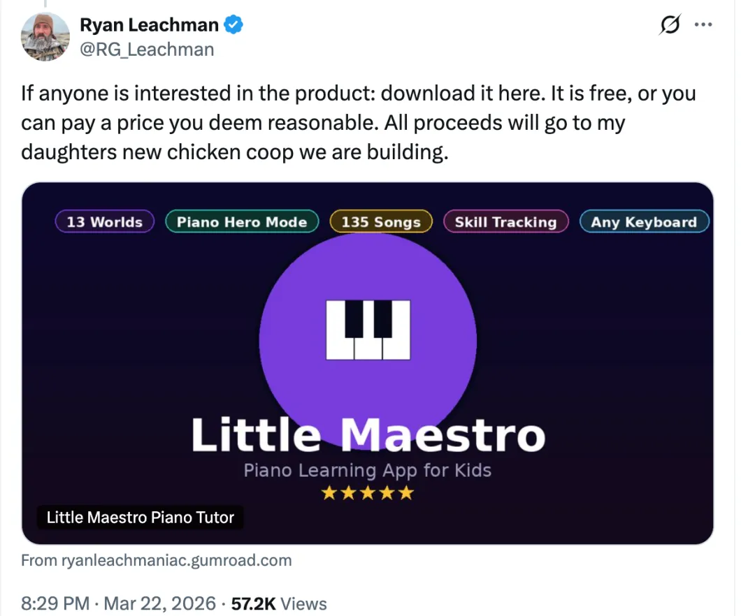 今年3月,一位名叫Ryan Leachman的美国父亲手搓AI钢琴学习应用在社交媒体上火了。