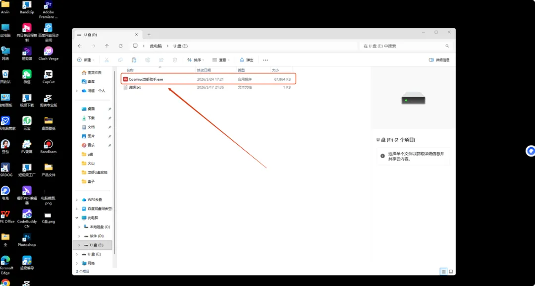 Cosmius AI 龙虾助手U 盘,是一款 即插即用本地 AI 工具,支持 Windows 10/11 系统(建议win11系统),免安装、开箱即用,直接运行小龙虾 AI OpenClaw 平台。采用 Type‑C + USB 双接口 设计,台式机、笔记本全兼容。