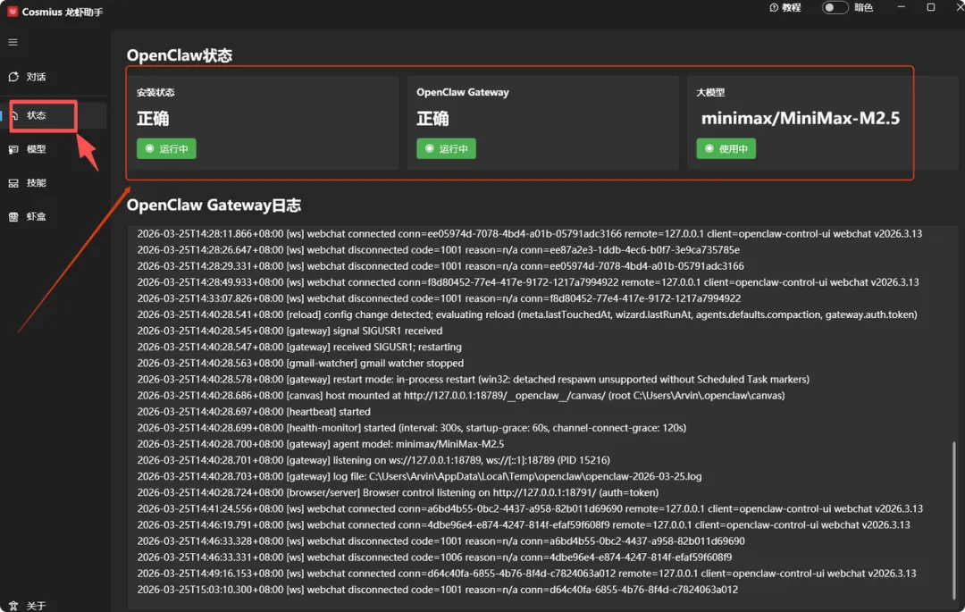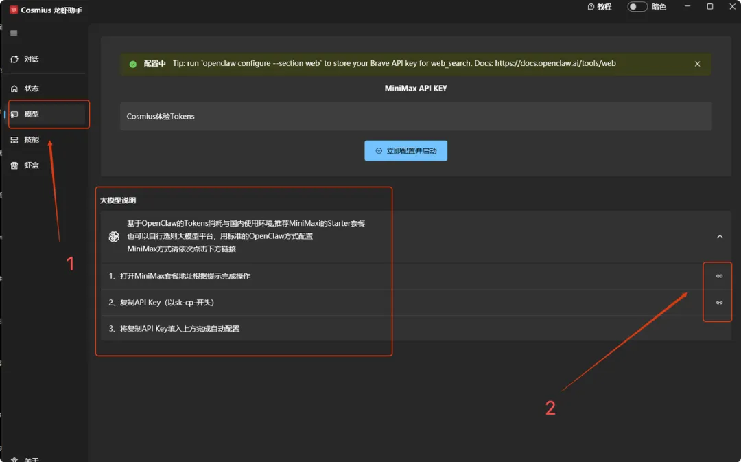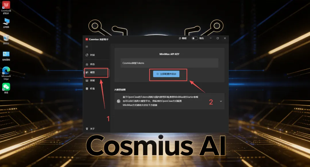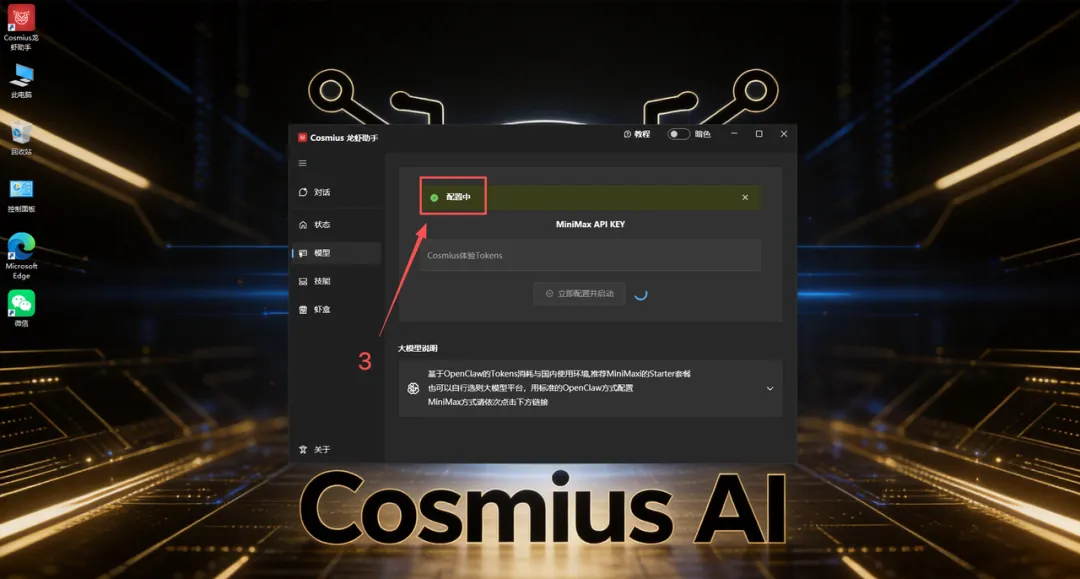 A:目前 Cosmius AI 仅内置 MiniMax 大模型一键快速接入;其他模型 API 需通过 OpenClaw 原生官方配置与对接协议手动连接。