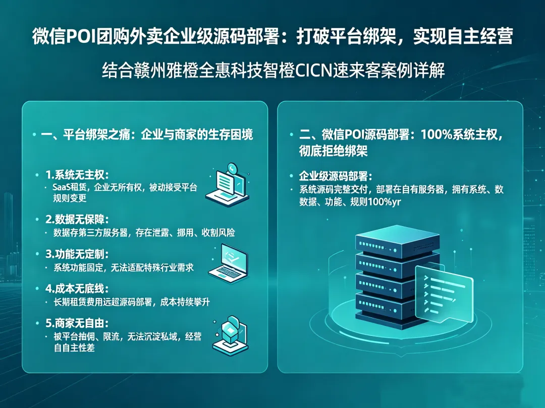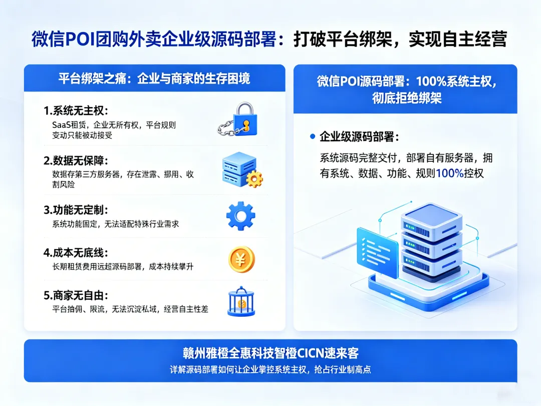 在本地生活服务行业,平台绑架一直是企业与商家的噩梦:企业租赁SaaS系统,每年支付高额费用,却没有系统所有权,平台涨价、停服,企业业务直接停摆;商家入驻传统团购平台,抽佣、规则、流量全由平台掌控,稍有不慎就被限流、下架,利润与经营自主权被双重剥夺。2026年,微信POI团购外卖企业级源码部署彻底打破这一困境,让企业拥有100%系统主权,拒绝平台绑架,实现自主经营、无限扩张。本文结合赣州雅橙全惠科技智橙CICN速来客,详解源码部署如何让企业掌控系统主权,抢占行业制高点。
