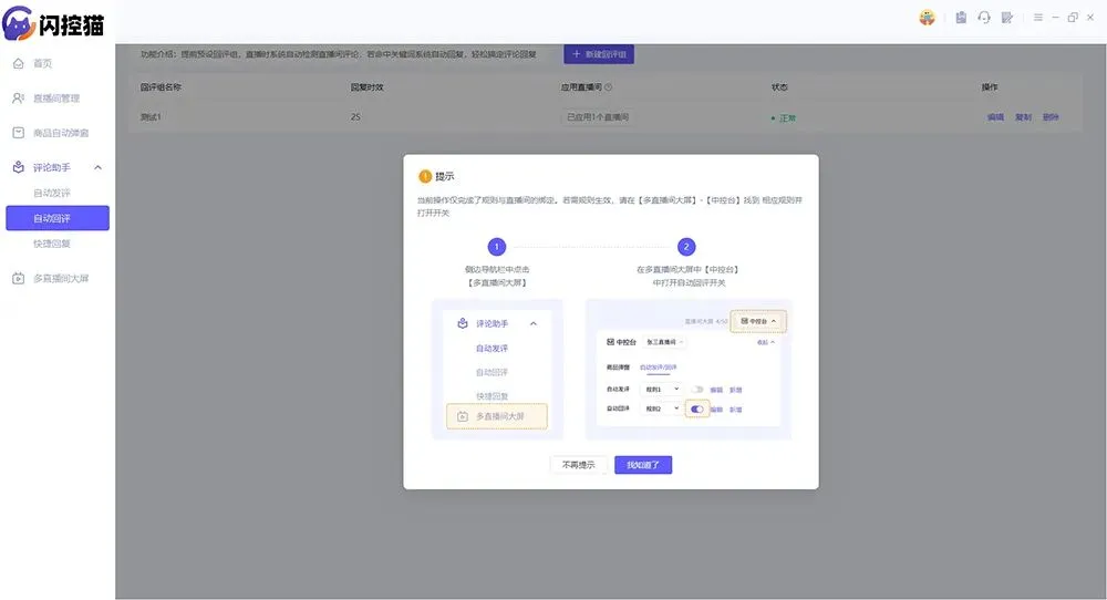 第二层,是解决“脑”的问题,也就是策略的智能化。单纯的循环播放只是基础,更关键的是如何让这个循环“有脑子”。比如,当评论区突然集中问某个商品时,系统能不能智能识别,并临时插队讲解这个商品?或者,根据直播间的实时在线人数和互动率,动态调整讲解的节奏?这就像自动驾驶汽车,不仅会按设定路线开,还能根据实时路况变道、避让。目前,一些先进的工具已经开始集成简单的策略逻辑。例如,你可以设置当评论区出现“想看XX”的关键词超过一定次数时,系统自动中断当前循环,优先讲解那个商品,之后再回到原计划。闪控猫的回评功能就能配合实现这一点,通过设置关键词触发规则,不仅能自动回复评论,还能联动商品弹窗,实现“即问即讲”,让自动循环不再是死板的播放列表,而是能感知直播间氛围的智能流程。