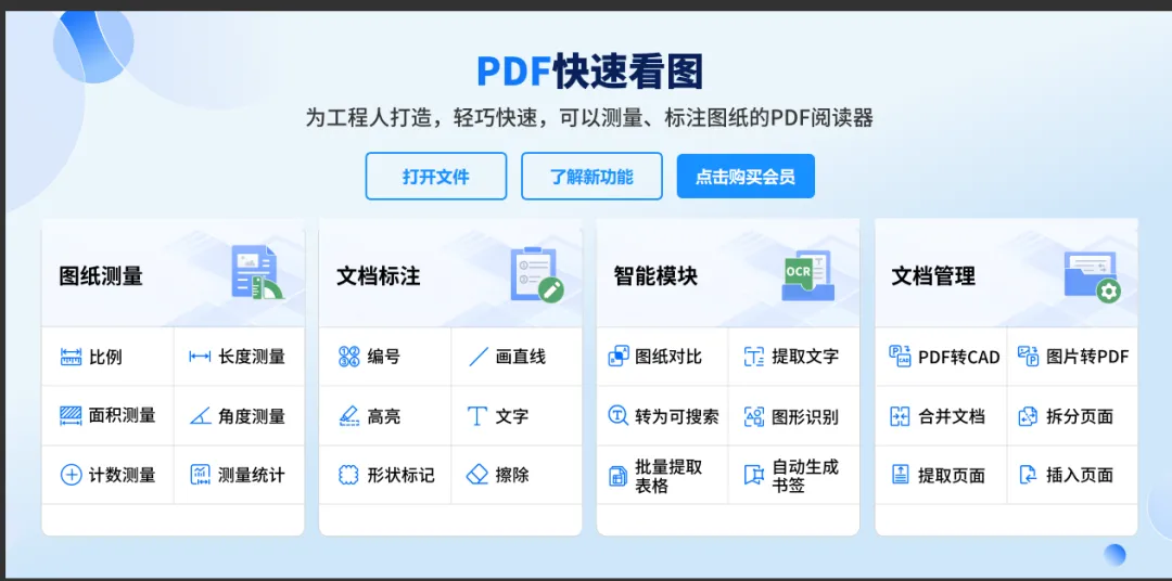 PDF快速看图主要针对工程建领域的专业用户,为工程人打造,轻巧快速,可以测量、标注图纸的PDF阅读器。核心目标是极速、高效、准确地在电脑上查看和批注PDF图纸,尤其是包含大量矢量图形的CAD转PDF文件。其功能可以归纳为以下几个核心方面: