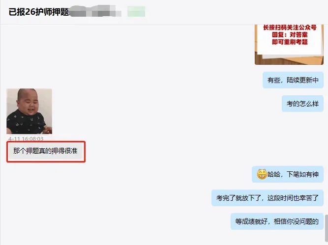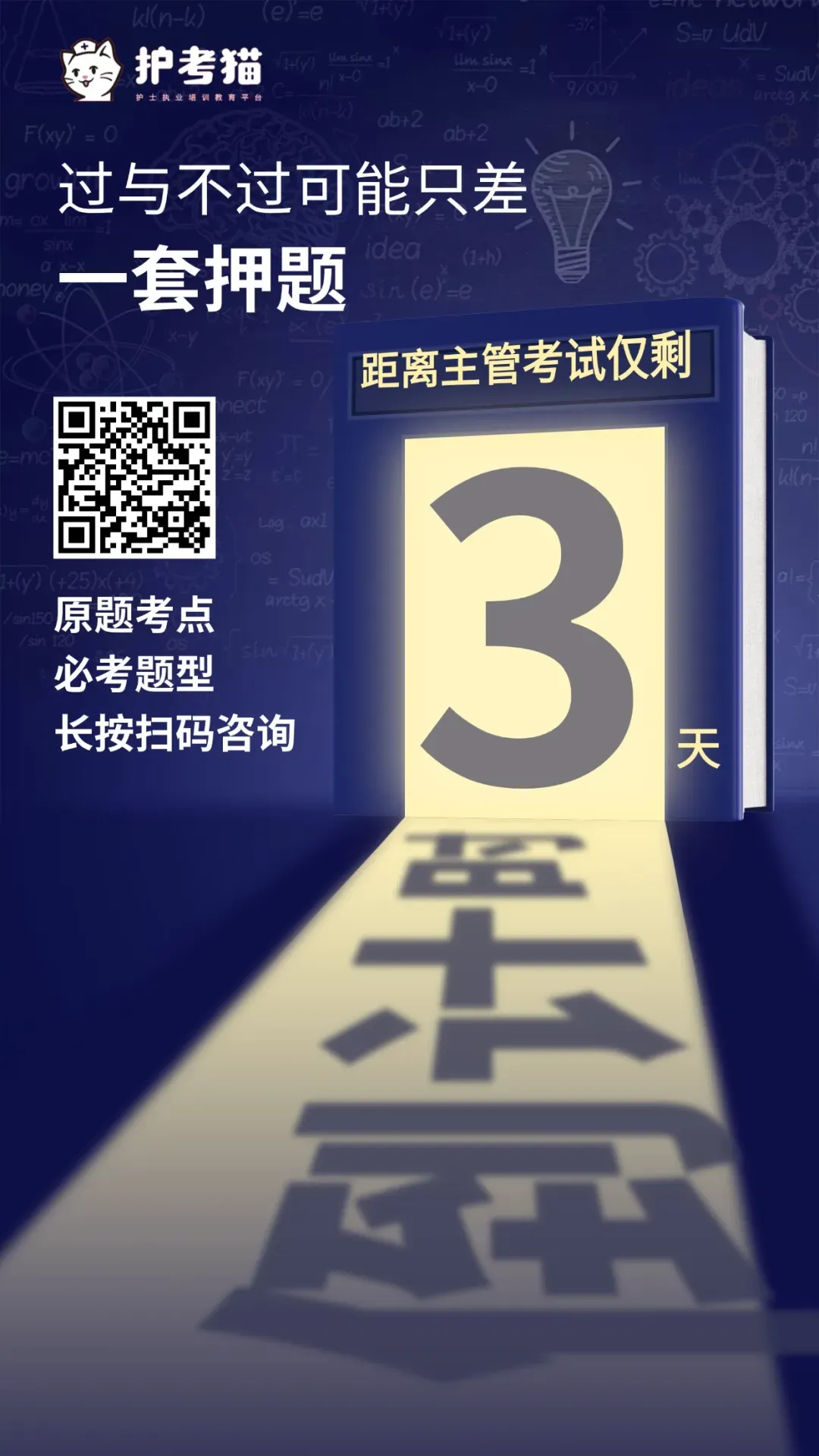 主管护师考前必背押题点.pdf 主管护师600押题点 点击下方图片跳转领取 预祝同学们考试顺利,高分上岸! 考试没把握,在及格线徘徊的同学注意了! 考前最后一根救命稻草 临时抱佛脚只学能精准提分的内容 《突击提分》2套绝密押题+24个蒙题大法 不要因为差一两分没过而后悔一年! 抓紧扫码咨询,底价取证! 满满的押题,实力回馈学员的信任!相信护考猫,分数一定高 考生好评不断! 准备考主管的同学,现在刷题完全来得及! 相信护考猫不会错!掌握好这份押题60分是没问题的 现在报名跟上老师有把握带你通过考试
