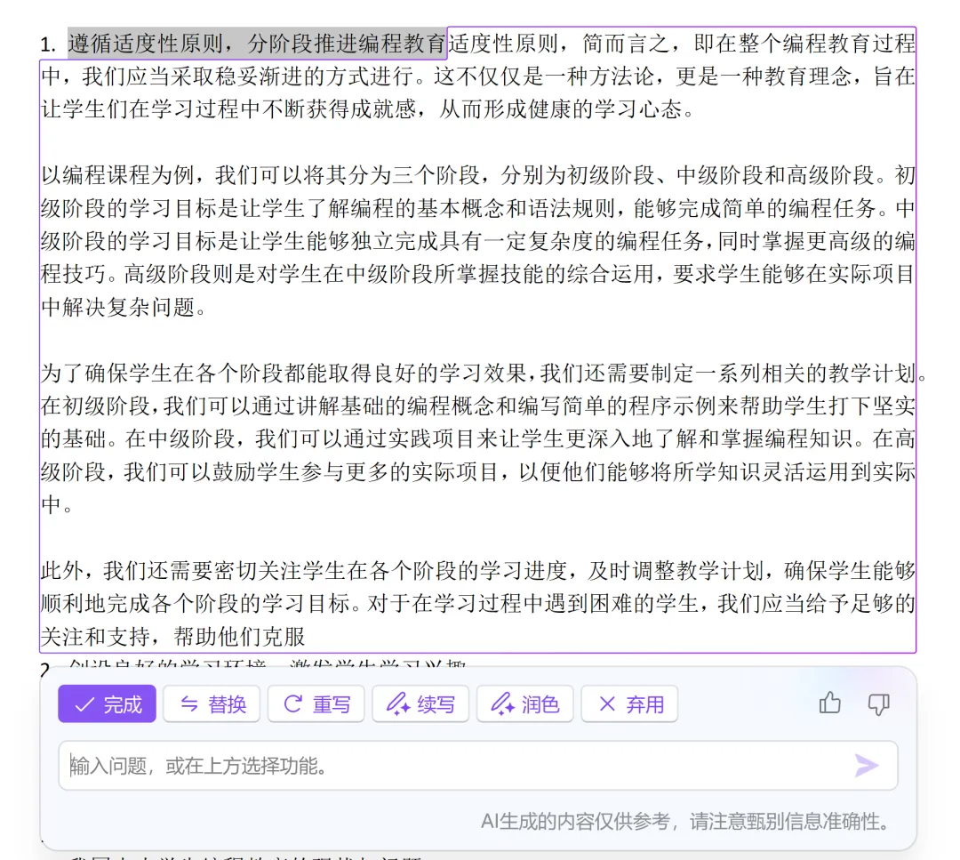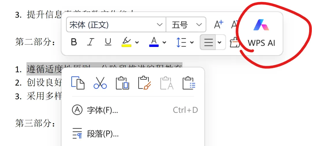 在WPS中用Ai生成提纲后,也可以选中其中的小标题,右键点击–Ai,让它续写。