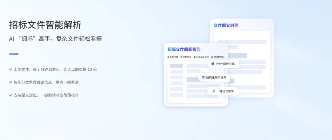 面对篇幅长、条款密集的招标文件,人工梳理容易忽略关键要求。AI 可对文件进行结构化拆解,提取报价限制、提交时限、格式标准、响应条目等核心信息,以清晰视图呈现关键节点,减少因理解不到位引发的违规风险。在标书编制环节,工具按照通用评审逻辑自动统一章节、排版、表述方式,让文件更符合电子评标与现场评审的阅读习惯,降低格式类问题发生率。
