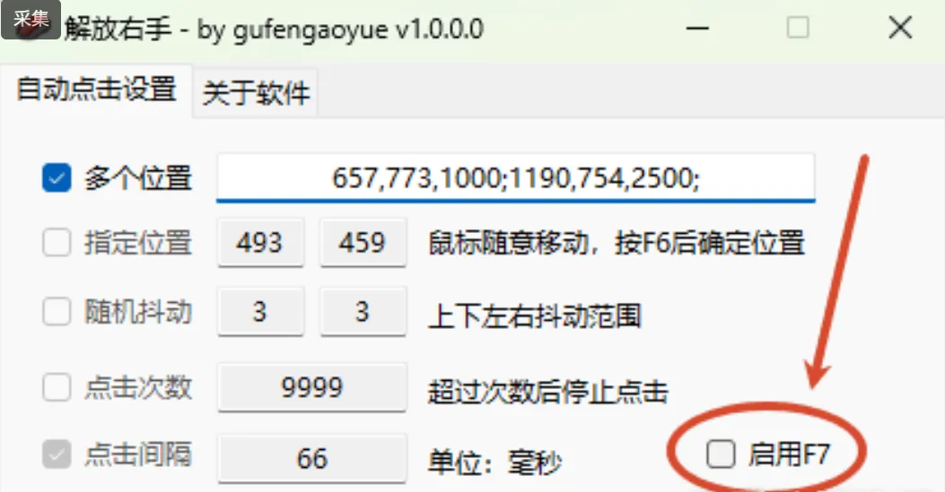 :鼠标移到目标位置按一下,坐标自动记录,不用手动输数字。 - F7 启停