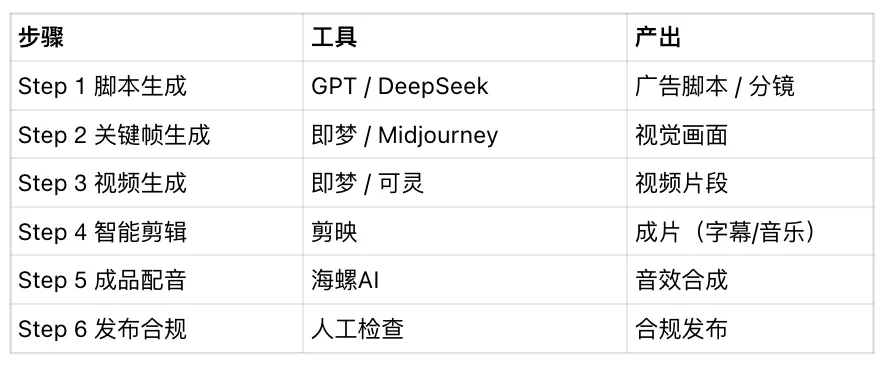 当前 AI 内容生产已经形成标准链路:脚本 → 画面 → 视频 → 剪辑 → 发布