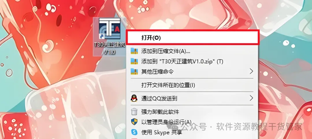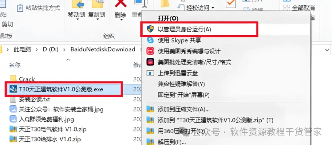 1.鼠标右键【天正建筑T30 V1.0】安装程序,选择【以管理员身份运行】。