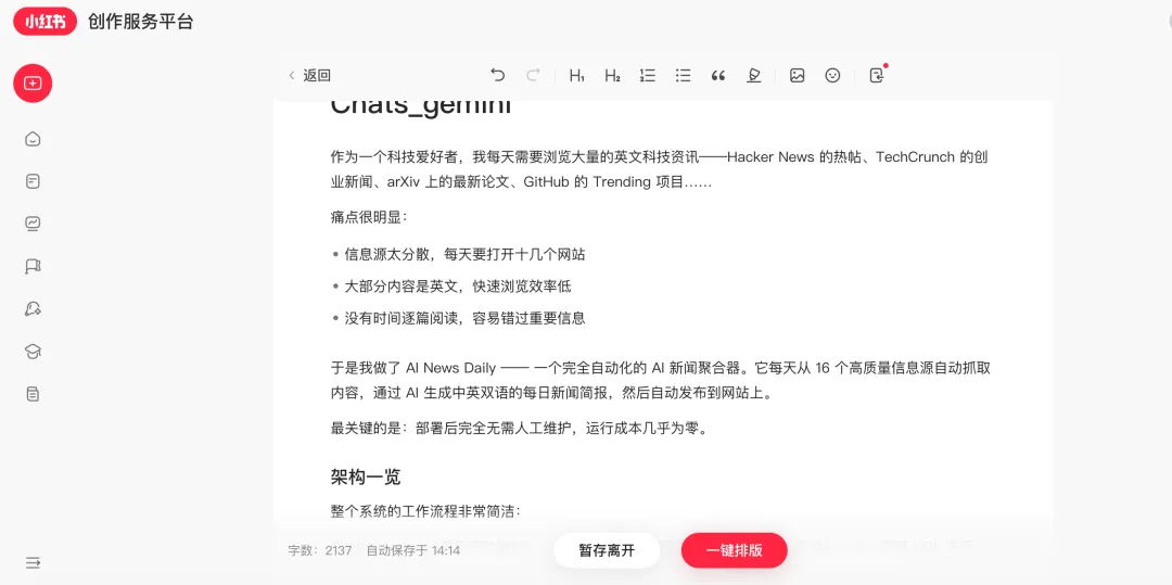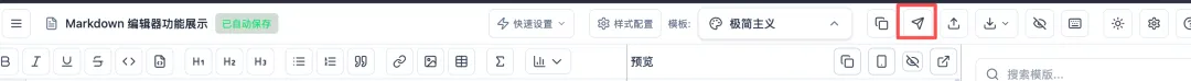 一键发布多平台插件需要配合编辑器使用,编辑器集成的发布功能,目前测试通过了公众号,小红书,今日头条三个平台。发布功能是调用浏览器插件的方式。