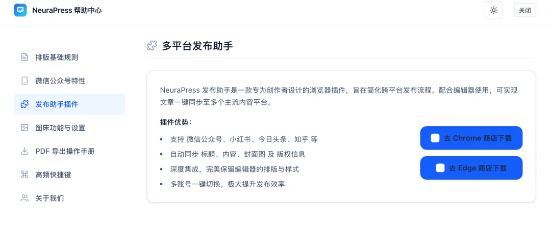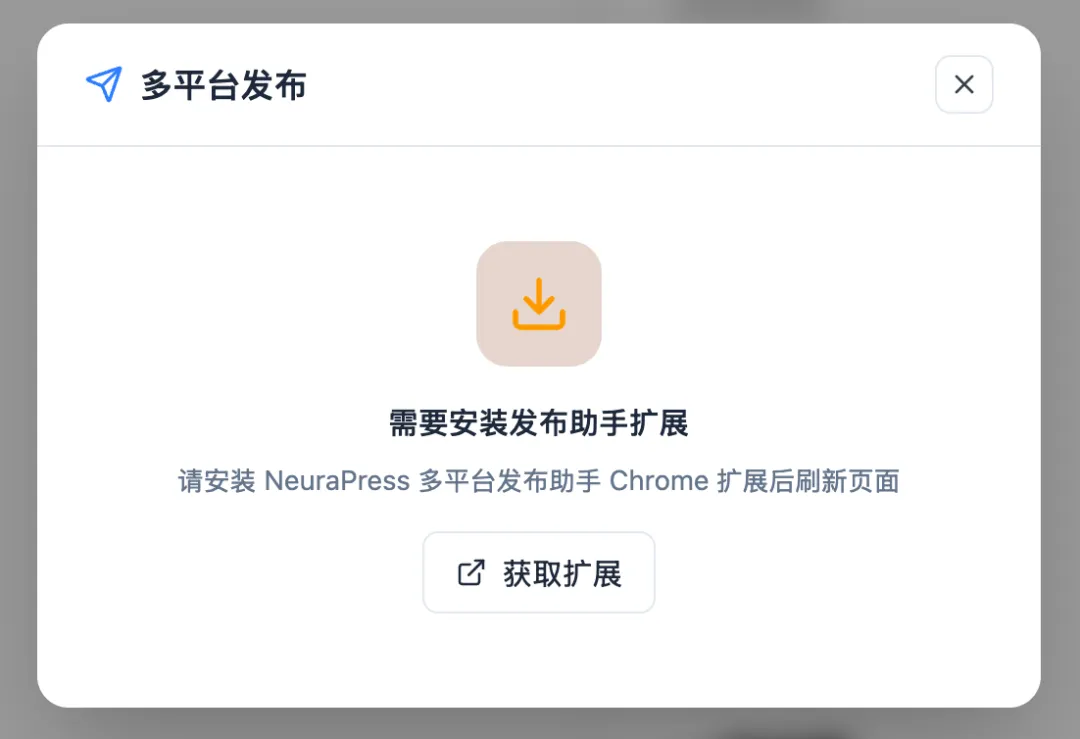 发布弹窗会检测插件是否安装,如果没用安装的话,点击获取扩展会跳到帮助页面,帮助页面有插件安装地址,支持 chrome ,edge 浏览器。