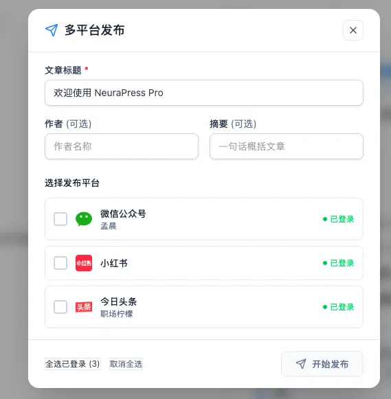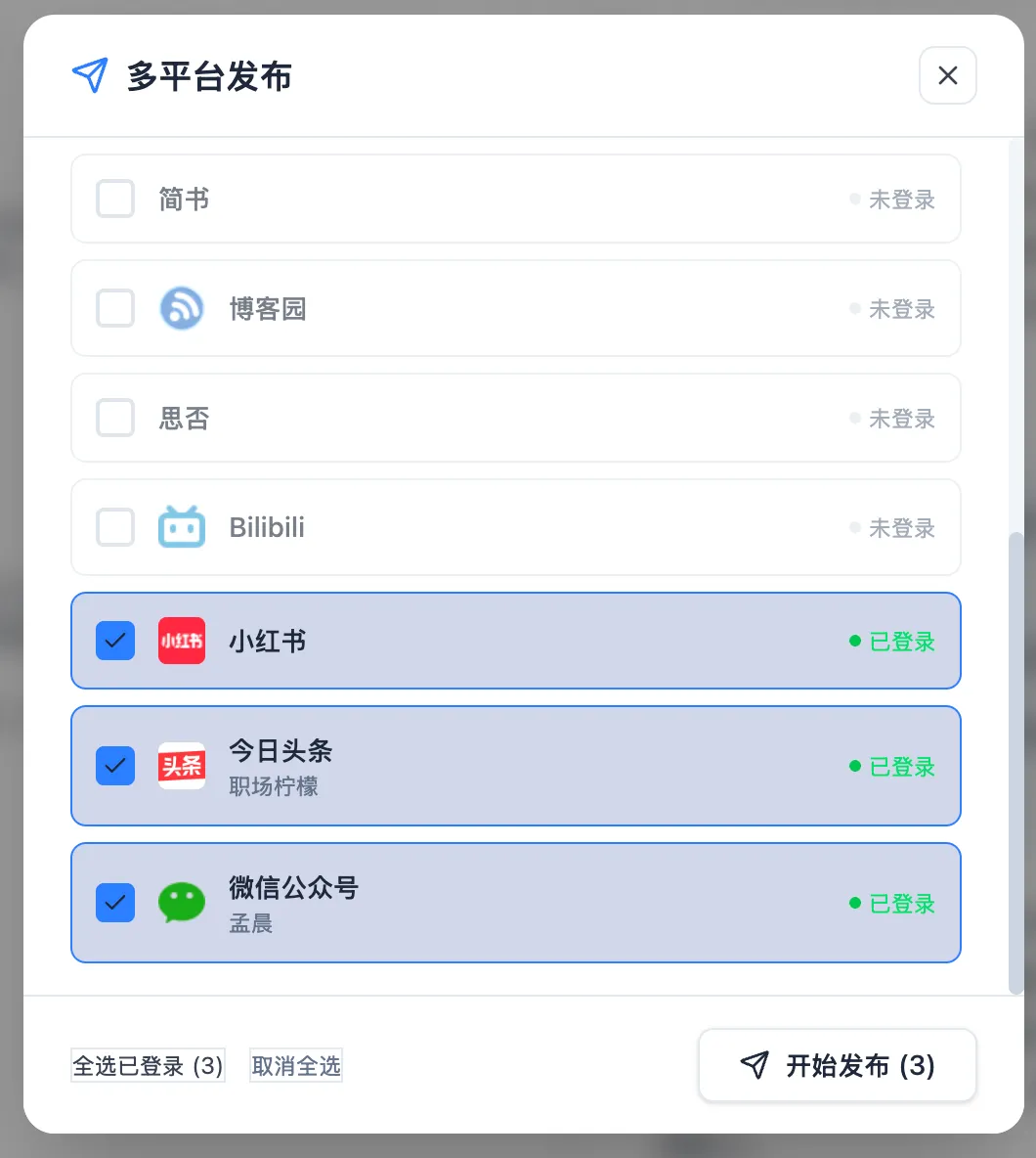 安装插件后,发布弹窗就可以正常加载了,会自动检测平台是否登录,没有登录的话,需要手动打开地址登录,登录成功后,登录状态就可以自动检测到了。目前可用的是公众号、小红书、头条,别的平台这个版本暂不支持,明明屏蔽了别的平台,结果上架后又出现了,下个版本会支持更多的平台 。